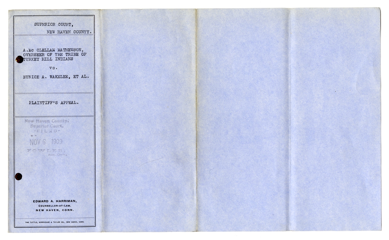 @file_rg003_nhsc_baai_ps_indigenouscases_mathewsonvswakelee_024_jpg:file {type: "Image/Asset with OCR", ocr_text: "SUPERIOR COURT, NEW HAVEN COUNTY. A. MC CLELLAN MATHEWSON, OVERSEER OF THE TRIBE OF TURKEY HILL INDIANS vs. EUNICE A. WAKELEE, ET AL. PLAINTIFF'S APPEAL. New Haven County, Superior Court. \"FILED\" NOV 6 1909 FOWLER, ASS'Y CLERK. EDWARD A. HARRIMAN, COUNSELLOR-AT-LAW, NEW HAVEN, CONN. THE TUTTLE, MOREHOUSE & TAYLOR CO., NEW HAVEN, CONN."}