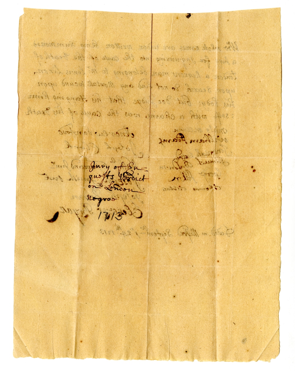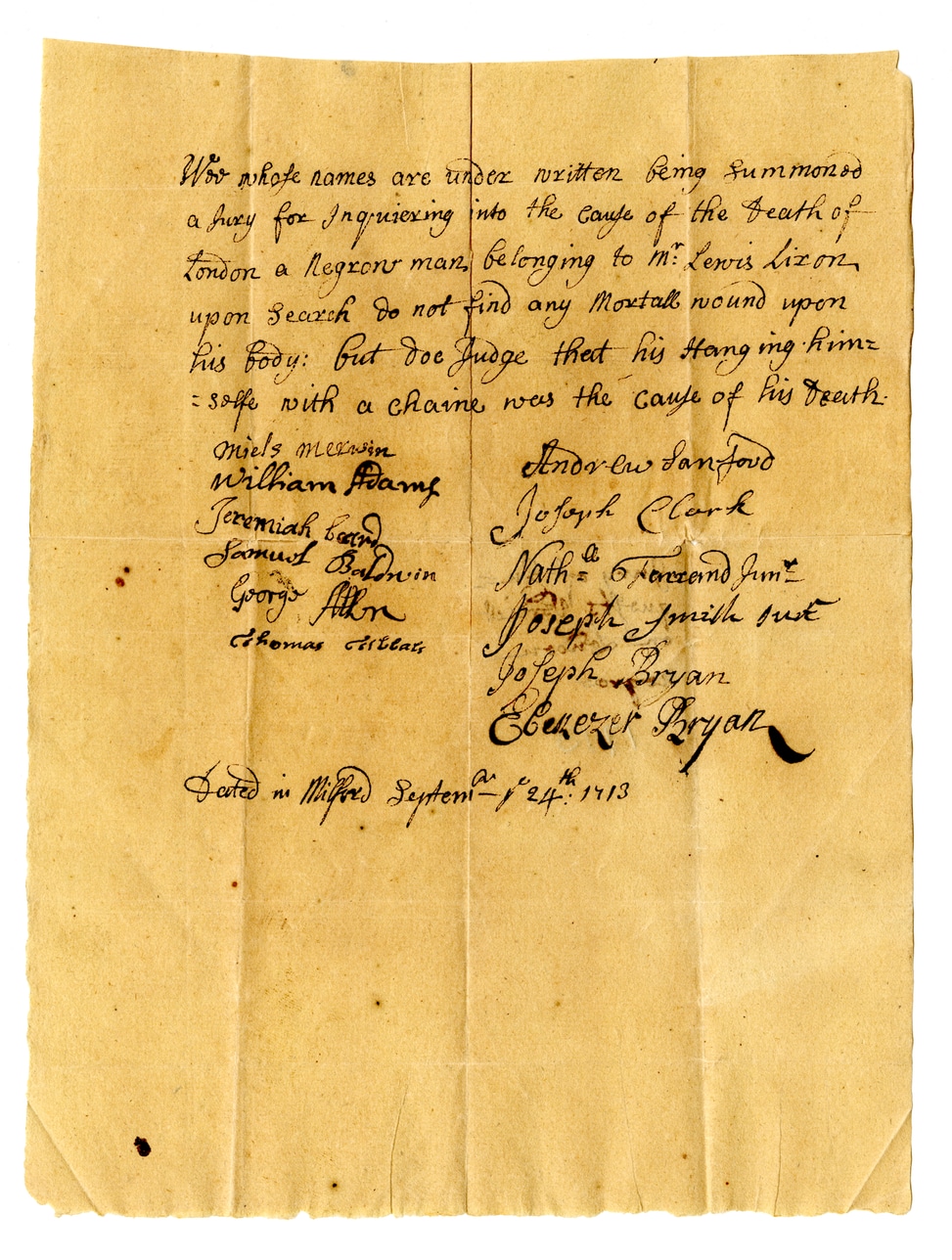 @file_rg003_nhsc_baai_ps_inquests_london_002_tif -> depicts -> @inquest_documents_londonWe whose names are under written being summoned a Jury for Inquiring into the cause of the Death of London a Negrow man, belonging to Mr. Lewis Lizon, upon Search do not find any mortal wound upon his body: But doe Judge that his Hanging himself with a chaine was the cause of his Death. Miels Messin William Adams Jeremiah Brad Samuel Baldwin George Allen Thomas Hibbert Andrew Sanford Joseph Clark Nath. & Terrand Jm. Joseph Smith out Joseph Bryan Ebenezer Bryan Lented in Milford Septemr 24th 1713