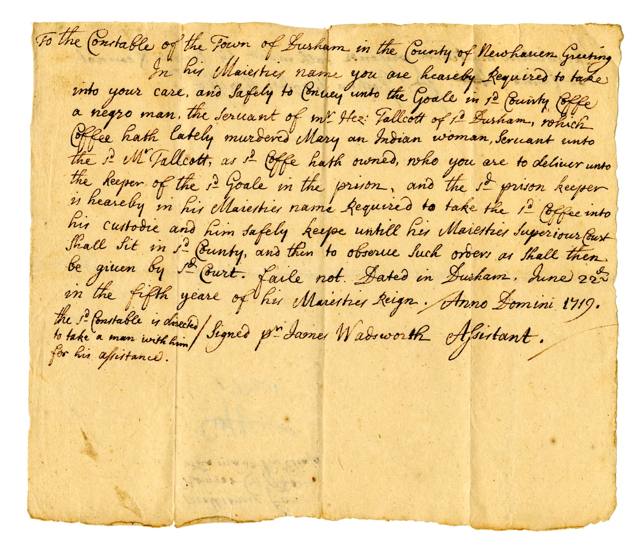 @nhsc_baai_cases_papers_subject:concept {description: "Subject terms for New Haven County Superior Court files involving Black, African American, and Indigenous individuals"}To the Constable of the Town of Durham in the County of New Haven. Greeting. In his Majesty's name you are hereby required to take into your care, and safely to convey unto the Goal in 1st County Office a negro man, the Servant of Mr. Hez: Fallcott of 1st Durham, which Office hath lately murdered Mary an Indian woman, Servant unto the 1st Mr. Fallcott, as 1st Office hath owned, who you are to deliver unto the keeper of the 1st Goal in the prison, and the 1st prison keeper is hereby in his Majesty's name required to take the 1st Coffee into his custody and him safely keep until His Majesty's Superior Court Shall Sit in 1st County, and then to observe such orders as shall then be given by 1st Court. Laile not. Dated in Durham, June 22nd in the fifth year of her Majesty's Reign. Anno Domini 1719. The 1st Constable is directed to take a man with him for his assistance. Signed pr James Wadsworth Assistant.