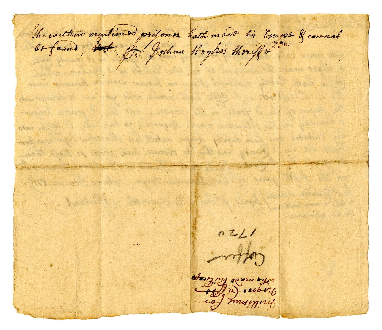 The within mentioned prisoner hath made his escape & cannot be found. Joshua Hoggis sheriff 1720 William Fox Negroes (illegible) who made his escape