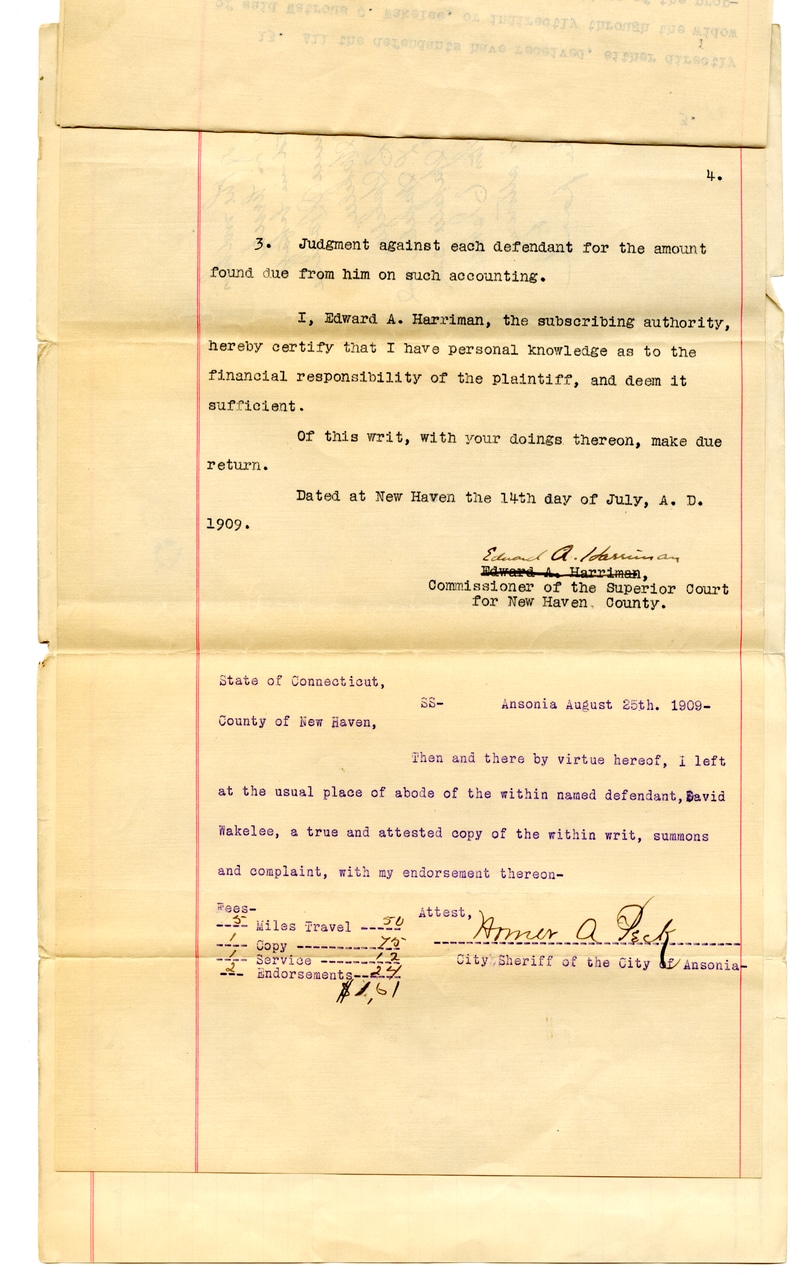 3. Judgment against each defendant for the amount found due from him on such accounting. I, Edward A. Harriman, the subscribing authority, hereby certify that I have personal knowledge as to the financial responsibility of the plaintiff, and deem it sufficient. Of this writ, with your doings thereon, make due return. Dated at New Haven the 14th day of July, A.D. 1909. Edward A. Harriman, Commissioner of the Superior Court for New Haven County. State of Connecticut, County of New Haven, Ansonia August 25th, 1909- Then and there by virtue hereof, I left at the usual place of abode of the within named defendant, David Wakelee, a true and attested copy of the within writ, summons and complaint, with my endorsement thereon- Becs- Miles Travel - $0.50 Copy - $0.70 Service - $1.22 Endorsements - $0.22 $2.61 Attest, Amer A. Peck City Sheriff of the City of Ansonia