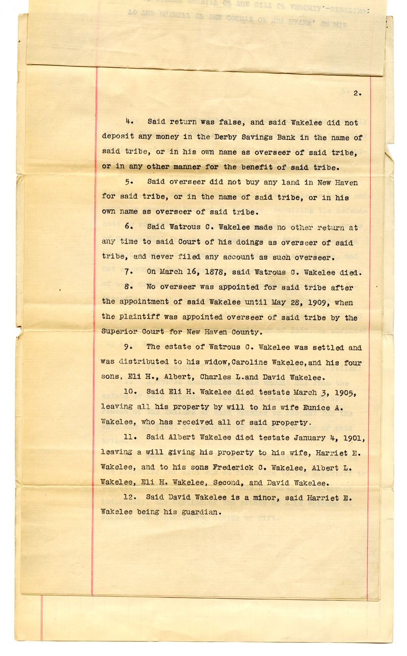 4. Said return was false, and said Wakelee did not deposit any money in the Derby Savings Bank in the name of said tribe, or in his own name as overseer of said tribe, or in any other manner for the benefit of said tribe. 5. Said overseer did not buy any land in New Haven for said tribe, or in the name of said tribe, or in his own name as overseer of said tribe. 6. Said Watrous C. Wakelee made no other return at any time to said Court of his doings as overseer of said tribe, and never filed any account as such overseer. 7. On March 16, 1878, said Watrous C. Wakelee died. 8. No overseer was appointed for said tribe after the appointment of said Wakelee until May 28, 1909, when the plaintiff was appointed overseer of said tribe by the Superior Court for New Haven County. 9. The estate of Watrous C. Wakelee was settled and was distributed to his widow, Caroline Wakelee, and his four sons, Eli H., Albert, Charles L. and David Wakelee. 10. Said Eli H. Wakelee died testate March 3, 1905, leaving all his property by will to his wife Munice A. Wakelee, who has received all of said property. 11. Said Albert Wakelee died testate January 4, 1901, leaving a will giving his property to his wife, Harriet E. Wakelee, and to his sons Frederick C. Wakelee, Albert L. Wakelee, Eli H. Wakelee, Second, and David Wakelee. 12. Said David Wakelee is a minor, said Harriet E. Wakelee being his guardian.