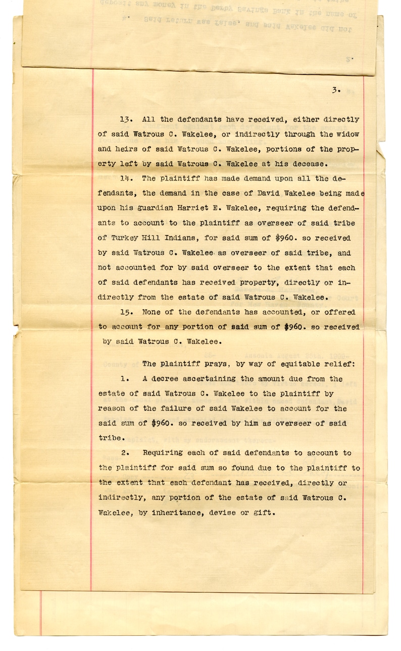 13. All the defendants have received, either directly of said Watrous C. Wakelee, or indirectly through the widow and heirs of said Watrous C. Wakelee, portions of the property left by said Watrous C. Wakelee at his decease. 14. The plaintiff has made demand upon all the defendants, the demand in the case of David Wakelee being made upon his guardian Harriet E. Wakelee, requiring the defendants to account to the plaintiff as overseer of said tribe of Turkey Hill Indians, for said sum of $960. so received by said Watrous C. Wakelee as overseer of said tribe, and not accounted for by said overseer to the extent that each of said defendants has received property, directly or indirectly from the estate of said Watrous C. Wakelee. 15. None of the defendants has accounted, or offered to account for any portion of said sum of $960. so received by said Watrous C. Wakelee. The plaintiff prays, by way of equitable relief: 1. A decree ascertaining the amount due from the estate of said Watrous C. Wakelee to the plaintiff by reason of the failure of said Wakelee to account for the said sum of $960. so received by him as overseer of said tribe. 2. Requiring each of said defendants to account to the plaintiff for said sum so found due to the plaintiff to the extent that each defendant has received, directly or indirectly, any portion of the estate of said Watrous C. Wakelee, by inheritance, devise or gift.