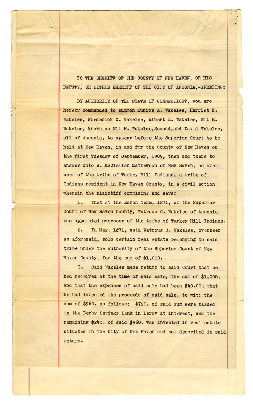 @accounting:concept {description: "Financial accounting of tribe assets"}TO THE SHERIFF OF THE COUNTY OF NEW HAVEN, OR HIS DEPUTY, OR EITHER SHERIFF OF THE CITY OF ANSONIA,—GREETING: BY AUTHORITY OF THE STATE OF CONNECTICUT, you are hereby commanded to summon Munice A. Wakelee, Harriet E. Wakelee, Frederick C. Wakelee, Albert L. Wakelee, Eli H. Wakelee, known as Eli H. Wakelee, Second, and David Wakelee, all of Ansonia, to appear before the Superior Court to be held at New Haven, in and for the County of New Haven on the first Tuesday of September, 1909, then and there to answer unto A. McClellan Mathewson of New Haven, as overseer of the tribe of Turkey Hill Indians, a tribe of Indians resident in New Haven County, in a civil action wherein the plaintiff complains and says: 1. That at the March term, 1871, of the Superior Court of New Haven County, Watrous C. Wakelee of Ansonia was appointed overseer of the tribe of Turkey Hill Indians. 2. In May, 1871, said Watrous C. Wakelee, overseer as aforesaid, sold certain real estate belonging to said tribe under the authority of the Superior Court of New Haven County, for the sum of $1,000. 3. Said Wakelee made return to said Court that he had received at the time of said sale, the sum of $1,000, and that the expenses of said sale had been $40.00; that he had invested the proceeds of said sale, to wit: the sum of $960, as follows: $720. of said sum were placed in the Derby Savings Bank in Derby at interest, and the remaining $240. of said $960. was invested in real estate situated in the City of New Haven and not described in said return.