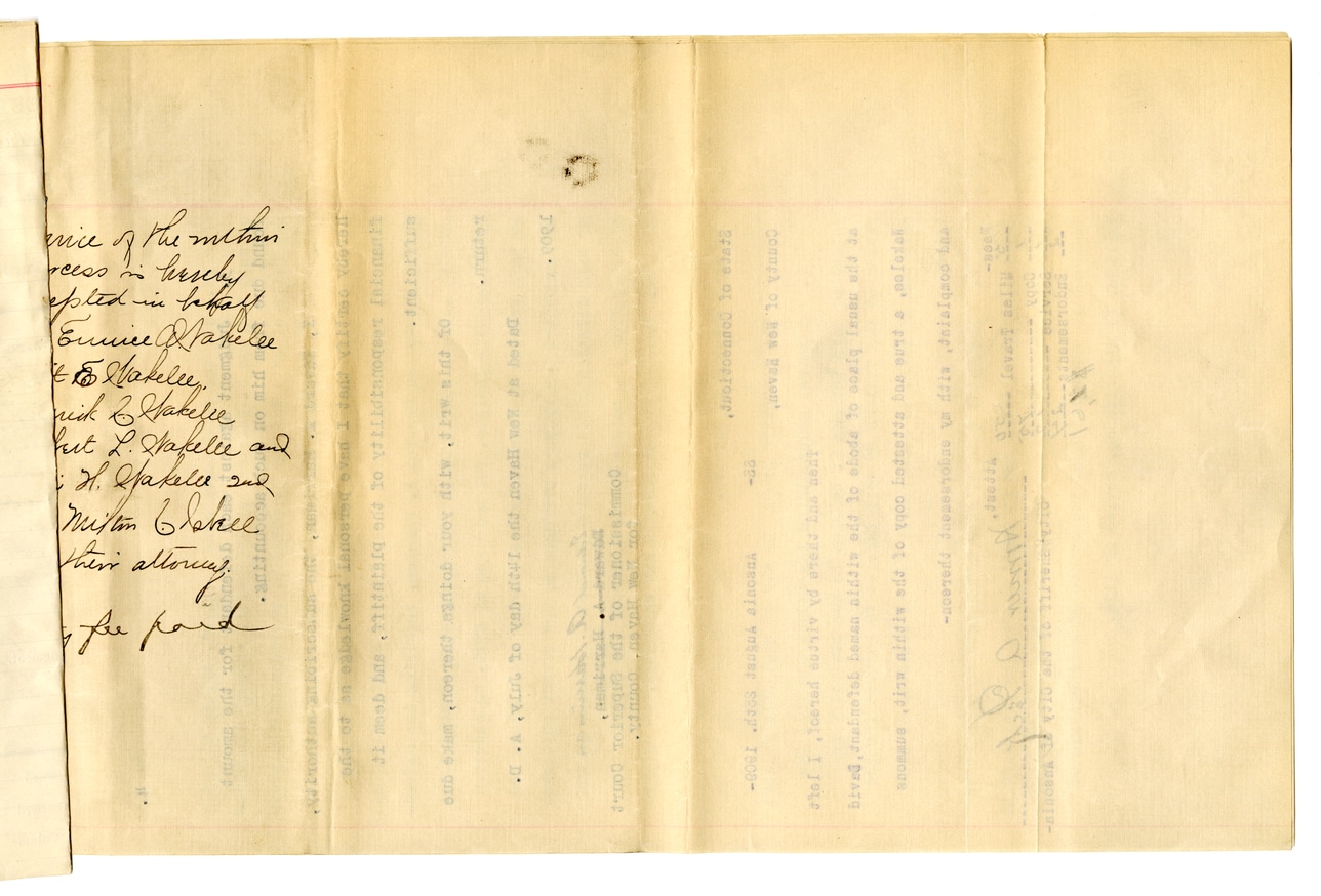 @date_1909_09_07:date_YYYY_MM_DD {year: 1909, month: 9, day: 7}service of the mutual process is hereby accepted in behalf Ernie & Hakelee Nick & Hakelee Bet L. Hakelee and H. Hakelee and Milton Blakee their attorney, by fee paid