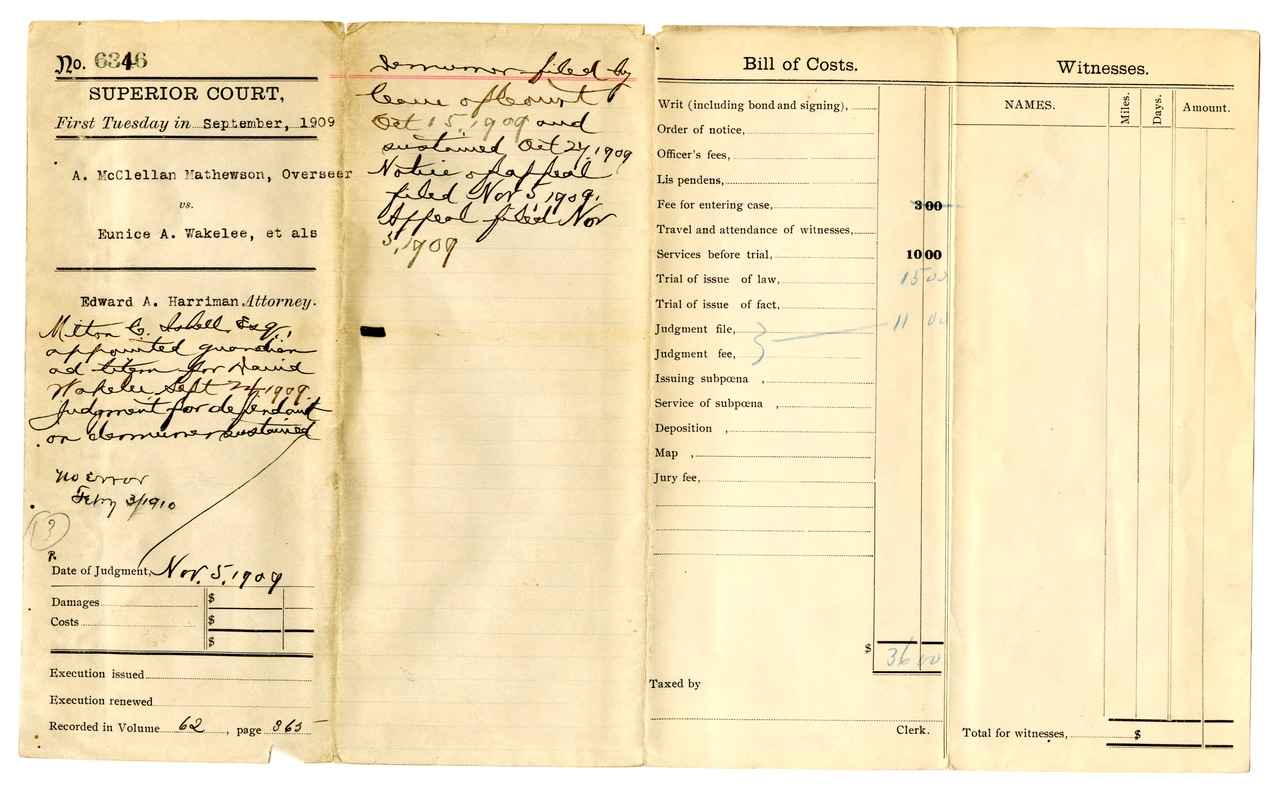 No. 6846 SUPERIOR COURT, First Tuesday in September, 1909 A. McClellan Mathewson, Overseer vs. Eunice A. Wakelee, et als Edward A. Harriman Attorney. Milton G. Isbell Esq., appointed guardian ad litem for David Wakelee Sept 7th 1909, judgment for defendant on claim was sustained. No error Febry 3/1910 Date of Judgment Nov. 5, 1909 Damages $ Costs $ Execution issued Execution renewed Recorded in Volume 62, page 365 Tomorrow filed by leave of Court Oct 15, 1909 and continued Oct 24, 1909 Notice of Appeal filed Nov 5, 1909. Appeal filed Nov 5, 1909 Bill of Costs. Writ (including bond and signing), ______ Order of notice, ______ Officer's fees, ______ Lis pendens, ______ Fee for entering case, 3.00 Travel and attendance of witnesses, ______ Services before trial, 10.00 Trial of issue of law, 15.00 Trial of issue of fact, ______ Judgment file, 11.00 Judgment fee, ______ Issuing subpoena, ______ Service of subpoena, ______ Deposition, ______ Map, ______ Jury fee, ______ $ 36.00 Taxed by ______ Clerk. ______ Total for witnesses, ______