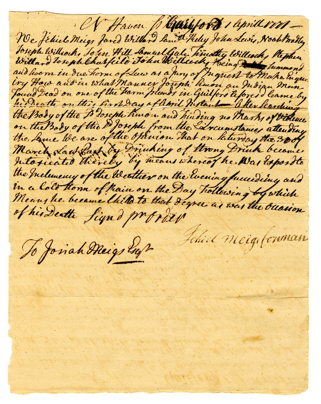 @nhsc_baai_cases_papers_subject:concept {description: "Subject-index field for New Haven County Superior Court Files – Black, African American, and Indigenous cases and papers"}N Haven & Guilford 1 April 1801 We, Jehiel Meigs Jared Willard Sam'l Riley John Lewis Noah Bradley Joseph Willson John Hill Samuel Gale Timothy Willcox Stephen Willard Joseph Charfield John Willcox being summoned and sworn in due form of law as a jury of Inquest to make enquiry how and in what manner Joseph Simon an Indian man found dead on one of the farm lands in Guilford supposed to be by his death on this first day of April instant—After learning the body of the D Joseph Simon and finding no marks of violence on the body of the D Joseph from the circumstances attending the same we are of the opinion that on Saturday the 20th March last past by drinking of strong drink became intoxicated thereby by means whereof he was exposed to the inclemency of the weather on the evening preceding and in a cold storm of rain on the day following by which means he became chilled to that degree as was the occasion of his death signed propr. Jo Joniah Meigs Esq'r Jehiel Meigs Comman