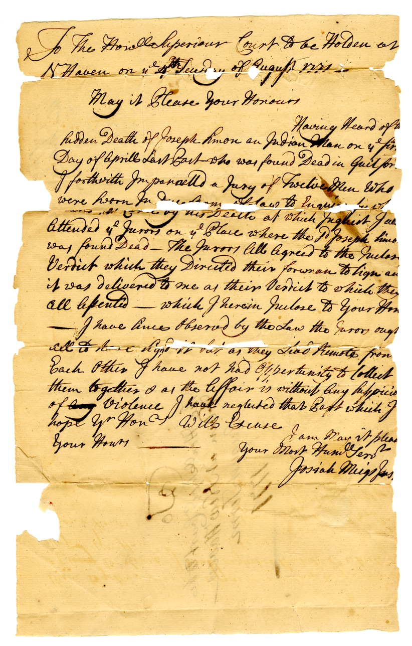 @nhsc_baai_cases_papers_subject:concept {description: "Subject-index field for New Haven County Superior Court files involving Black, African American, and Indigenous cases and papers"}To the Honorable Superior Court to be Holden at N. Haven on 12th Sunday of August, 1773. May it Please Your Honours, Having heard of the sudden death of Joseph Simon an Indian man on 4th day of April last past—who was found dead in Guilford I forthwith impaneled a jury of twelve men who were sworn in pursuant to law to inquire into the cause of his death at which Inquest I attended & jurors on 4th place where the said Joseph Simon was found dead—the jurors all agreed to the fatal verdict which they directed their foreman to sign and it was delivered to me as their verdict to which they all assented—which I herein inclose to your Hon. I have since observed by the law the jurors ought all to be signed in but as they had remote from each other I have not had opportunity to collect them together & as the affair is without any suspicion of violence I have neglected that part which I hope your Hon. will excuse. I am May it please your Most Humble Servant, Josiah Migges