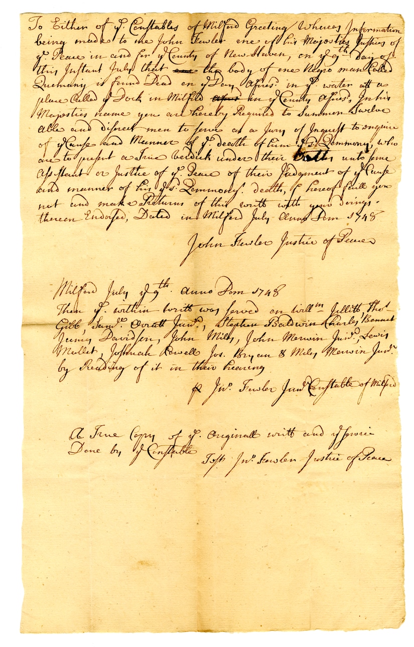 @file_rg003_nhsc_baaai_ps_inquests_quemany_002_tif -> image of -> @inquest_quommong_1748:eventTo either of ye Constables of Wilford Greeting: Wheresoever information being made to the John Fawler, one of his Majesty's Justices of Peace in and for ye County of New Haven, on ye 9th day of this Instant July, that the body of one Negro man called Quenmaney is found dead on Dony Bayes, in ye water at a place called Dock in Wilford, in ye County aforesaid, in his Majesty's name you are hereby Required to Summon twelve able and discreet men to serve as a Jury of Inquest to enquire of the cause and manner of ye death of him called Quenmaney, who are to present a true bill or bill under their hands unto some Assistant or Justice of ye Peace of their Judgment of cause and manner of his ye Lemmody! death, if thereof shall you not end make Returns of this writ with your oaths therein Endorse, Dated in Wilford July 12th Anno Dom 1748 John Fawler Justice of Peace Wilford July 9th. Anno Dom 1748 There of within writ was served on willm Jullitt The Gill, Sam'l Dratt Junr., Stephen Baldwin Charles Bennett Quincy Davidson, John Mott, John Mervin Junr., Lewis Mullett, Joshua Rowell Jos. Bryen & Miley Mervin Junr. by Reading of it in their hearing. JW. Fawler Junr Constable of Wilford A True Copy of ye Original writ and affixed Done by ye Constable Jsp JW Fawler Justice of Peace