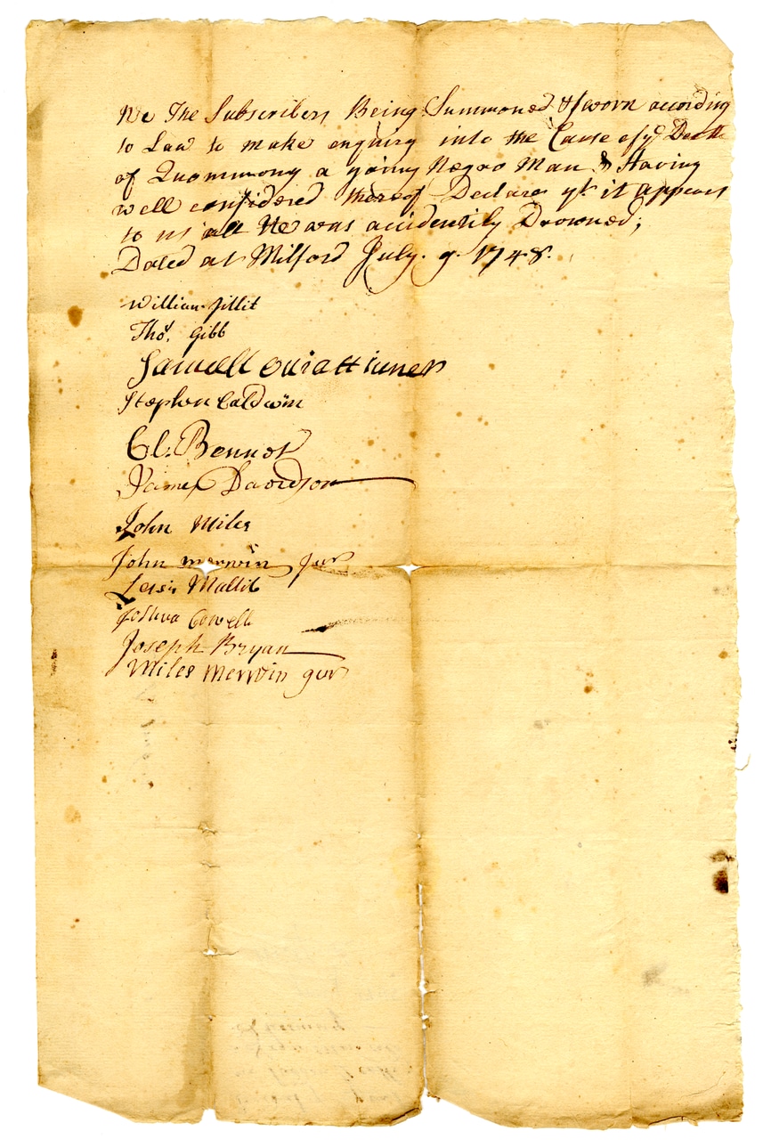 We the subscribers being summoned & sworn according to law to make inquiry into the cause of death of Quommong a young negro man & having well considered thereof declare that it appears to us all he was accidentally drowned; Dated at Milford July 9, 1748. William Pickett Tho. Gibb Samuel Ouattamens Stephen Caldwell Cl. Bennet James Davidson John Miles John Mervin Jnr. Leslie Mallib Joshua Conwell Joseph Bryan Miles Mervin gov