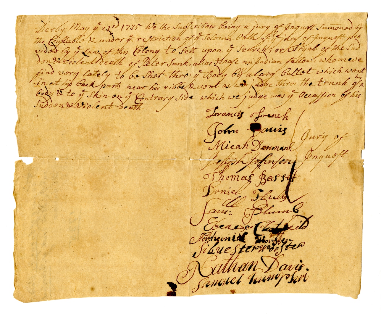 @samuel_humphrey -> member of -> @jury_of_augustaDerby May 4th 1735 We the subscribers being a jury of Inquest summoned by the Constable & under restriction of a solemn oath of jury of Inquest provided by law of this Colony to settle upon & search, or tryal of the sudden & violent death of Peter Sank, alias Hoase an Indian fellow, whom we find very lately to be shot thro'g body by a large bullet which went in at his back parts near his ribs & went as we judge thro' the trunk of his body & to skin on the contrary side which we judge was occasion of his sudden & violent death. Francis French John Davis Micah Benman Joseph Johnston Thomas Bassett Daniel Fuller Sam. Plum Ebenzer Catfield Nathaniel Worster Silvester Worcester Nathan Davis Samuel Humphrey