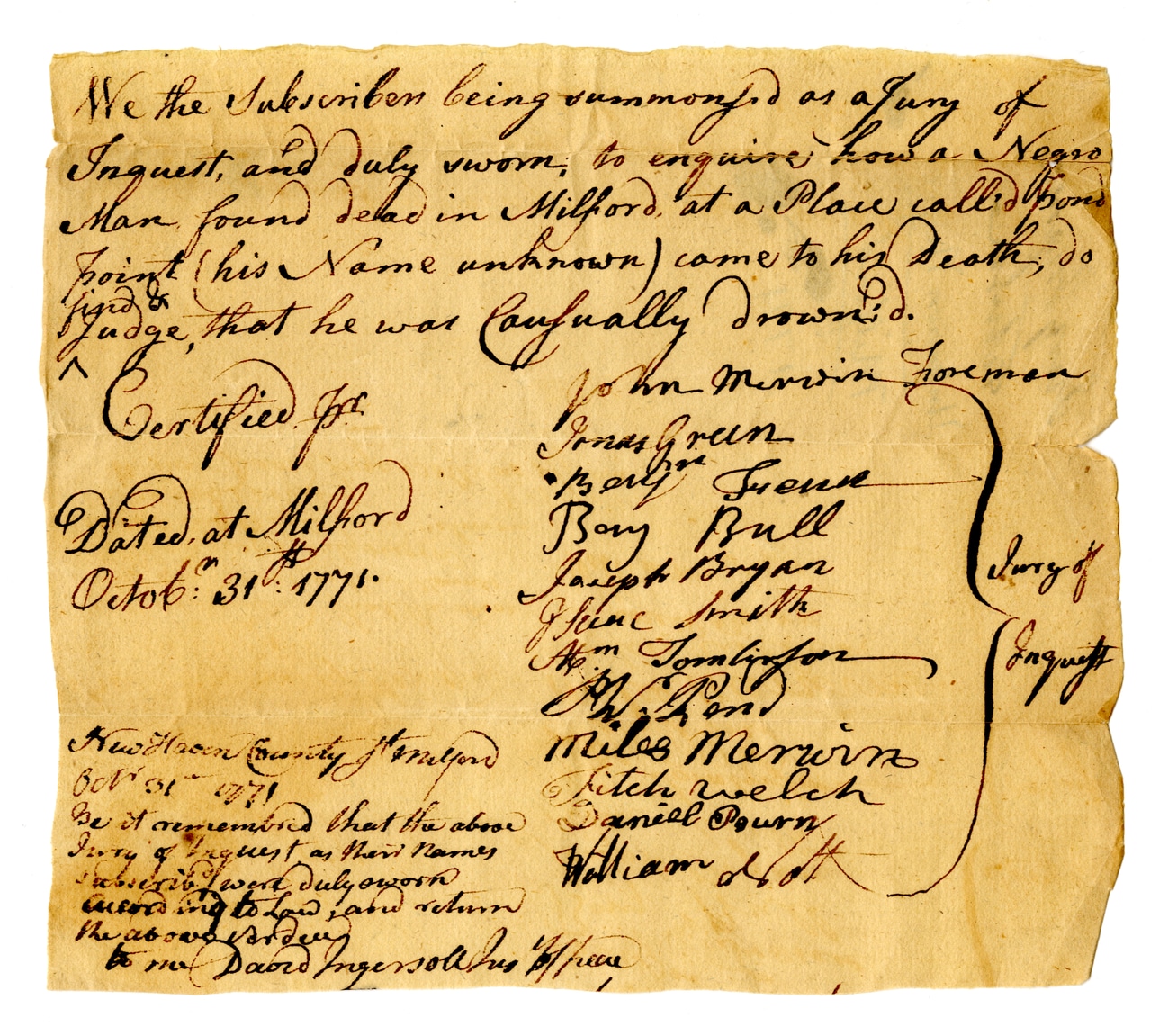 @inquest_document -> subject -> ["Inquests", "Drowning", "African American history", "Legal documents"]We the subscribers being summoned as a Jury of Inquest, and duly sworn, to enquire how a Negro Man found dead in Milford at a Place called Pond Point (his Name unknown) came to his Death, do find & judge that he was Casually drowned. Certified for Dated at Milford Octob: 31: 1771. New Haven County of Milford Oct' 31 - 1771 Be it remembered that the above Jury of Inquest as their Names subscribed were duly sworn according to law, and return the above order to me David Ingersoll his Office, John Merrin Foreman Jonas Green Bergy Greene Bory Bull Joseph Bryan Grace Smith Ann Tomlinson Wm. Con Miles Merrin Fitch Welch Daniel Purn William Scott