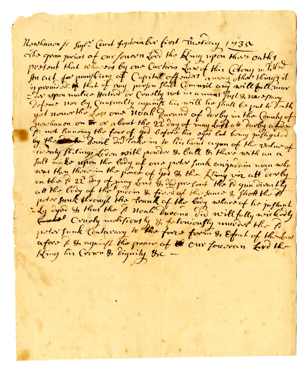 @indictment_document -> subject -> @nhsc_baai_cases_papers_subjectNewhaun for Supr' Court September first Thursday 1735 The open purview of our sovereign Lord the King upon their oaths present that whereas by our Captain Law of this Colony in Titled An act for punishing of Capital offends among other things it is provided that if any person shall commit any willfull murder upon malice Hatred or Cruelly not in a mans just & necessary Defense nor by Casually against his will he shall be put to death yet neverthless Noah Durand of derby in the County of newhaun on or about the 22 day of may last att derby above did not fearing the fear of god expose his eyes but being preludged by the said Noah did take in to his hand again of the value of twenty shillings leaden with powder & ball & there with an a Jalt made upon the body of one Peter Junk an Indian man who was then there in the power of god & the King viz att derby in the 22 day of may last & did proprant the po gun directly att the body of the said Peter Junk & fired of the same & flied the po peter junk through the trunk of the body whereof he instantly ly dyed & thus the said Noah Durand did willfully wickedly cruelly maliciously & feloniously murder the po peter junk contrary to the force form & Effect of the laws before & against the peace of our sovereign Lord the King his Crown & dignity etc
