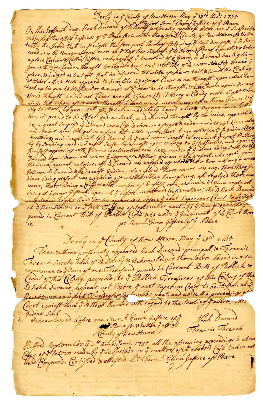 @bond_of_noah_durand -> subject -> @colonial_americaDerby in County of New-Haven May 4 23rd A.D. 1735 Before Saml Gunn Justice of Peace On this present day, Noah Durand of St Derby personally appearing before me & subscribing one of his Majesty's officers by virtue of of Peace for & within the said County of New-Haven, he voluntarily declared that in night, the fore part the long following last day past, he Durand was by Nangantogue river on a Catt Ted Thursday 4th New and being something below a place Colonel Fuller's Cattle rock against a lower end of Island, he Durand having his gun with him reason thought he heard a deer only west side of a river, strictly viewed of place, & judged as he saith that he discovered the white of a deer's tail towards the Caking of which which still appeared to him like troops of a deer as he thought, & took up his gun to his shoulder & aimed at it as he thought, & took aim again & many times thought he did not clear enough discern it; it being a cloudy moon light evening, but when afterwards thought if deer would move away, after three times trying to shoot his gun went off. He immediately heard a man say you have killed me, it proved to be Peter Indian Sunk, as he Durand thought by his voice, upon which in a great surprize he Durand ran a Catt Ted river, in a fright endeavoured to give him water and spoke to him, but got no answer, but within a very short time after he & his companions began breathing and innocuously. Durand by it next means sought to acquaint of next settler by sending word in night season by a messenger coming to of subscriber, and again himself appearing with Indians declaration as to here made, if Indians being South or Durand again examined when, if Sagamore & other Indians were present, who again gave the same account, as before, also he Durand was enquired of what there ever was any quarrel between he Durand & the decest Indian, who replies, there never was any, then they Indians being present was enquired of whether they knew of any, all replied there was none, that not being a considerable number of English men who made it some reply, all being at Surgeon's house, upon all it before mentioned considerations, the de Noah Durand is certified to your Bond for his appearance before of next Superior Court to certify at St New-Haven on first Tuesday of September next, to of sum of one thousand pounds in Current Bills of Publick Credit & to abide judgment of of Court there in. Saml Gunn Justice of Peace Derby in County of New-Haven May 4 23rd 1735 Then & there personally appeared Noah Durand principally, & Francis Trench Surety both of St Derby & acknowledged themselves bound in a rare cognizance of claim of one thousand pounds in Current Bills of Publick Credit of this Colony payable to of Publick Treasurer of this Colony of the de Noah Durand appear not before of next Superior Court to be stayed at St New-Haven on first Tuesday of September next, and abide the proceedings of Court against him of Noah Durand with regard to the shooting of above mentioned Indian, Bank Acknowledged Before me Saml Gunn Justice of Peace for District of agreed County of New-Haven Noah Durand Francis Trench Nifford September 9th anno Domini: 1735 all the foregoing proceedings is a true copy of of Entries made by of Subscriber in of matter of of above Capt taken out hand Composed, Certified & attested Pr Saml Gunn Justice of Peace