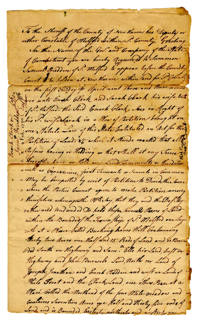 @file_pinax -> documents -> @new_haven_county_superior_court_writ_and_summons_collection:collection {title: "New Haven County Superior Court Writ and Summons Collection", creator: @new_haven_county_superior_court, institution: @connecticut_state_library, created_range: @date_1700_1800, language: "en", subjects: ["Writ and Summons","Land Partition","Legal Documents","New Haven County","Milford","Enoch Clark","Sarah Clark","Samuel Braden"], places: [@new_haven_county, @milford, @buckingham_hill, @four_mile_meadows]}