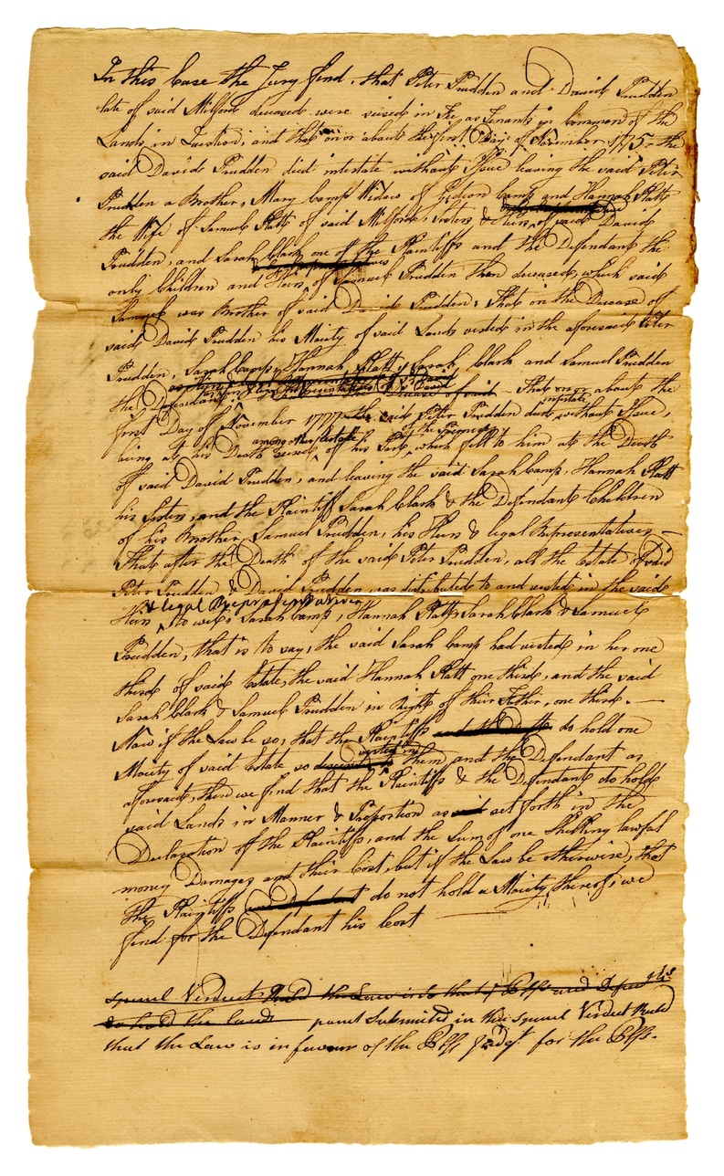 In this cause the Jury find, that Peter Pudden and David Pudden, both of said Milford, deceased were seized in the possession of the lands in question, and they never about their lives. On 15th December 1775, the said David Pudden died intestate without issue leaving the said Peter Pudden a brother, Mary, Sarah, Hannah, Sarah Black, and Hannah Pratt, the wife of Samuel Pratt, of said Milford, sisters to heirs of said David Pudden, and Sarah Black one of the plaintiffs and the Defendant the only children and heirs of David Pudden then deceased which said Sarah was brother of said David Pudden's heirs on the decease of said David Pudden he left of said lands vested in the appurtenances of Peter Pudden, Sarah, Hannah Pratt, Hannah Black and Samuel Pudden the remainder of the lands in question. That is about the first day of November 1777, the said Peter Pudden died intestate without issue, being at his death seized of his lands which fell to him into the hands of said David Pudden, and leaving the said Sarah Black, Hannah Pratt his sister, and the Plaintiff Sarah Black & the Defendant's children of his brother Samuel Pudden, his heirs & legal representatives. That after the death of the said Peter Pudden, all the estate of said Peter Pudden & David Pudden was divided to and settled by the said Sarah Black, Sarah Pratt, Hannah Pratt & Sarah Black & came to Pudden, that is to say, the said Sarah Black had vested in her one third of said estate, the said Hannah Pratt one third, and the said Sarah Black & Samuel Pudden in right of their sister, one third. Now if the law be so, that the Plaintiffs do hold one moiety of said estate as tenants in common and the Defendant as heir, then we find that the Plaintiffs & the Defendants do hold said lands in manner & proportion as act forth in the declaration of the plaintiff, and the sum of one shilling lawful money damages and their costs, but if the law be otherwise, that the Plaintiff do not hold a moiety thereof, we find for the Defendant his costs. General verdict: That the Law is in favor of the Plaintiff for the Defendent the land. Point submitted in the general verdict that the Law is in favor of the Plaintiff for the Defendent.