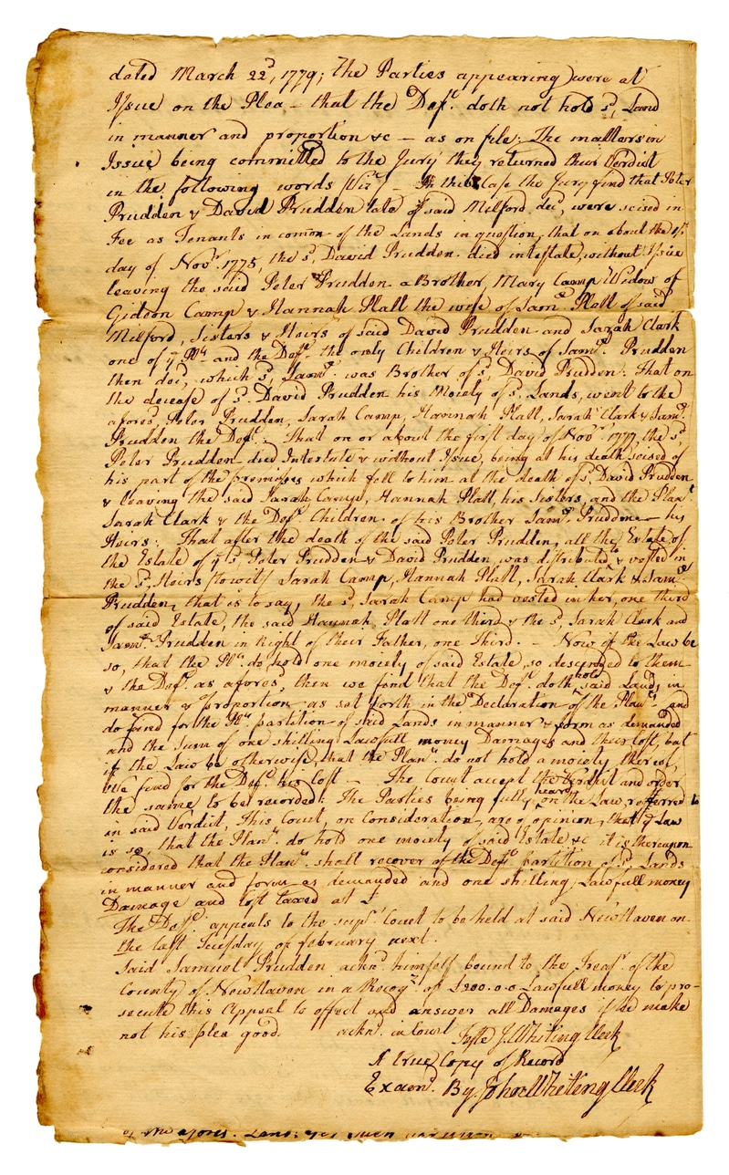 @court_record -> subject -> [@land_partition, @inheritance]dated March 22, 1779; the Parties appearing were at Ipswic on the Plea - that the Def. doth not hold of Lord in manner and proportion &c - as on file: The main issue being committed to the Jury they returned their verdict in the following words viz - In this case the Jury found that Peter Prudden v David Prudden, late of said Milford, Esq., was seized in Fee as Tenants in common of the lands in question, that on about the 4th day of Nov. 1775, the s. David Prudden died intestate, without issue leaving the said Peter Prudden a brother Mary Camp, Widow of Gideon Camp v Hannah Hall, the wife of Saml Hall, said Milford, sisters & heirs of said David Prudden and Sarah Clark one of his & the Def. the only children & heirs of Saml Prudden then dec, which S. Hannah was Brother of S. David Prudden. That on the decease of S. David Prudden his moiety of said lands went to the aforesd Peter Prudden, Sarah Camp, Hannah Hall, Sarah Clark & Hannah Prudden the Def. Had on or about the 4th day of Nov. 1779 the s. Peter Prudden died intestate & without issue, being at his death seised of his part of the premises which fell to him at the death of David Prudden & leaving the said Hannah Camp, Hannah Hall, his sisters and the said Sarah Clark & the Def's children, of his brother Saml Prudden - his heirs. That after the death of the said Peter Prudden, all the estate of the lands of S. Peter Prudden & David Prudden was divided & conveyed to the s. Hannah & Sarah Camp, Hannah Hall, Sarah Clark & Hannah Prudden, that is to say, the s. Sarah Camp has vested in her one third of said estate, the said Hannah Hall one third & the s. Sarah Clark and Hannah Prudden in right of their Father, one third. Now if the law be so, that the s. do hold one moiety of said estate, so described to them & the Def. as afores, then we find that the Def. doth said lands in manner & proportion, was not worth in the Declaration of the Plea, do find for the Def. partition of said lands in manner & form as damages and the sum of one shilling lawful money. Damages and special loss, but if the law be otherwise, that the Plea do not hold a moiety thereof, be saved for the Def. his loss. The court accept the verdict and order the same to be recorded. The Parties being fully on the law referred to in said verdict. This Court, on consideration, are of opinion, that by law is so, that the Plnt. do hold one moiety of said estate &c it is therefore considered that the Plnt. shall recover of the Def. partition of said lands in manner and form as damages and one shilling, lawful money Damage and let taxed at 1. The Def. appeals to the next Court to be held at said New Haven on the last Thursday of February next. Said Samuel Prudden, after himself bound to the Treas. of the county of New Haven in a Money of $300.00 lawful money to pro-secute this Appeal to effect and answer all Damages if he makes not his plea good. Wm Jullietting Clerk I true copy of record Exam'd By Jullietting Clerk