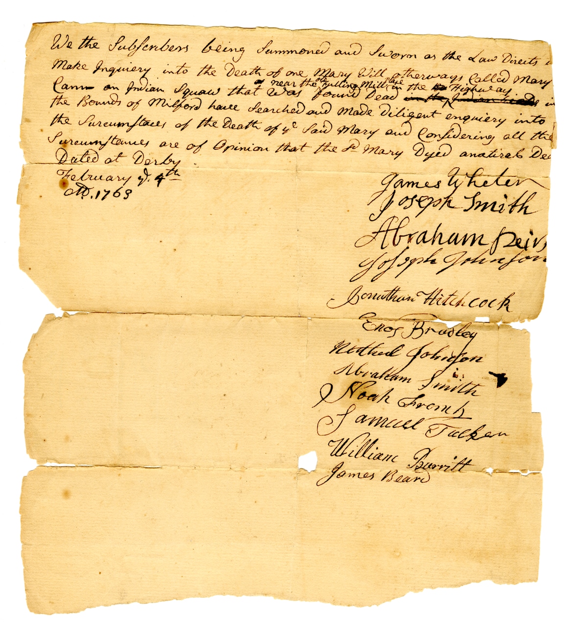 @inquest_document -> indexed in -> @nhsc_baai_cases_papers_subjectWe the subscribers being summoned and sworn as the law directs to make inquiry into the death of one Mary Hill otherwise called Mary Cann an Indian Squaw that was found dead near the grist mill on the highway in the bounds of Milford have searched and made diligent enquiry into the circumstances of the death of said Mary and considering all the circumstances are of opinion that she Mary died a natural death. Dated at Derby February 4th 1763 James Wheter Joseph Smith Abraham Peirce Joseph Johnson Jonathan Hitchcock Emos Bradley Nicholas Johnson Abraham Smith Noah Brown Samuel Talcott William Burritt James Beare