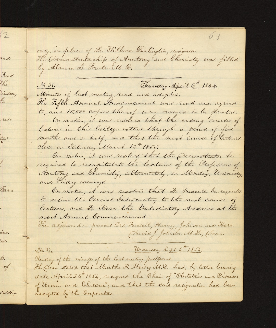 @file_a092_001_067_jpg:file {title: "Page containing Meeting 36"} -> documents -> @meeting_36only, in place of Dr. Hilbern Darlington, resigned. The Demonstratorship of Anatomy and Chemistry was filled by Almira L. Fowler M.D. No. 31. Thursday April 6th 1854. Minutes of last meeting read and adopted. The Fifth Annual Announcement was read and agreed to, and 10,000 copies thereof were ordered to be printed. On motion, it was resolved that the ensuing course of lectures in this College extend through a period of five months and a half; and that the next course of lectures close on Saturday March 12th 1855. On motion, it was resolved that the Demonstrator be required to recapitulate the lectures of the Professors of Anatomy and Chemistry, alternately, on Monday, Wednesday, and Friday evenings. On motion, it was resolved that Dr. Fussell be requested to deliver the General Introductory to the next course of lectures, and Dr. Kerr the Valedictory Address at the next Annual Commencement. Then adjourned:—present Drs. Fussell, Harvey, Johnson and Kerr. David J. Johnston M.D., Dean. No. 32. Wednesday Sept. 6th 1854. Reading of the minutes of the last meeting postponed. The Dean stated that Martha A. Morry M.D. had, by letter bearing date April 26th 1854, resigned the Chair of "Obstetrics and Diseases of Women and Children"; and that the said resignation had been accepted by the Corporators.