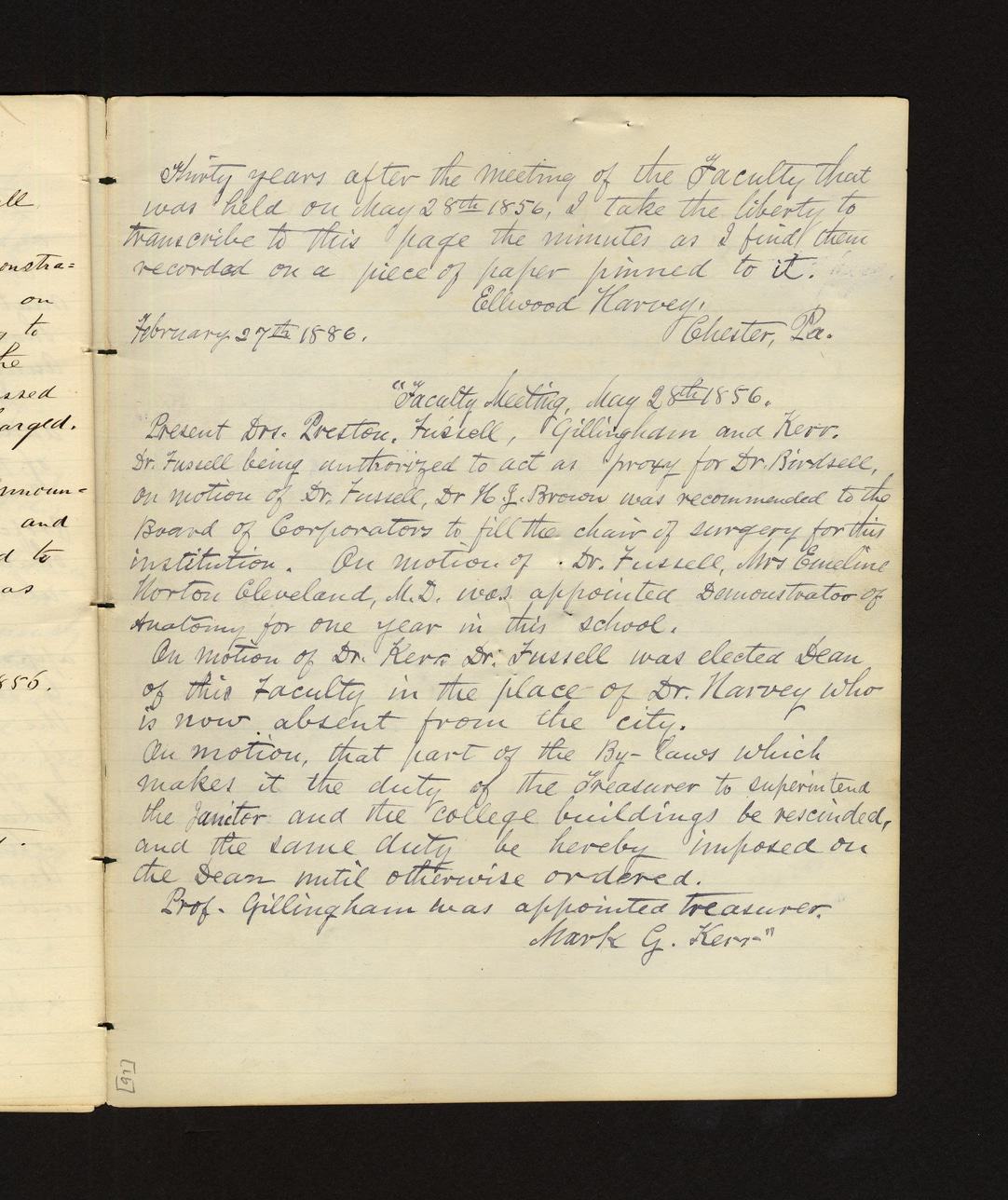@ellwood_harvey -> wrote -> @transcription_note:document {date: @date_1886_02_27, location: @chester_pa}Thirty years after the meeting of the Faculty that was held on May 28th, 1856, I take the liberty to transcribe to this page the minutes as I find them recorded on a piece of paper pinned to it. Ellwood Harvey February 27th, 1886. Chester, Pa. "Faculty Meeting, May 28th, 1856. Present Drs. Preston, Russell, Gillingham and Kerr. Dr. Russell being unauthorized to act as proxy for Dr. Birdsell, on motion of Dr. Russell, Dr. H.L. Brown was recommended to the Board of Corporators to fill the chair of surgery for this institution. On motion of Dr. Russell, Mrs. Caroline Horton Cleveland, M.D. was appointed Demonstrator of Anatomy for one year in this school. On motion of Dr. Kerr, Dr. Russell was elected Dean of this faculty in the place of Dr. Harvey who is now absent from the city. On motion, that part of the By-laws which makes it the duty of the Treasurer to superintend the Janitor and the college buildings be rescinded, and the same duty be hereby imposed on the Dean until otherwise ordered. Prof. Gillingham was appointed treasurer. Mark G. Kerr"
