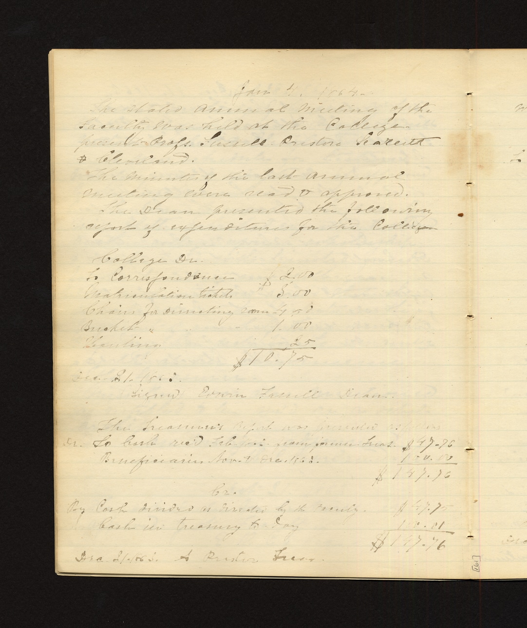 Jan 4, 1864 The 30th Annual Meeting of the Faculty was held at the College. Professors Russell, Preston, Seaver, & Cleveland. The minutes of the last annual meeting were read & approved. The Dean presented the following report of expenditures for the College: College Dr. To correspondence $2.00 Matriculation tickets $5.00 Chairs for sewing room $4.50 Brushes $1.00 Cleaning $2.50 $10.75 Jan 8th, 1864 Signed Erwin Freuler Dean. The Treasurer's Report was presented as follows: Dr. To Cash received Feb. 1st from committee fees $147.76 Beneficiaries Nov. & Dec. 1863 $10.00 $157.76 Cr. Pay Cash dividends as directed by the treasury $147.76 Cash in treasury to day $10.00 $157.76 Jan 8/64 A Preston Secr.