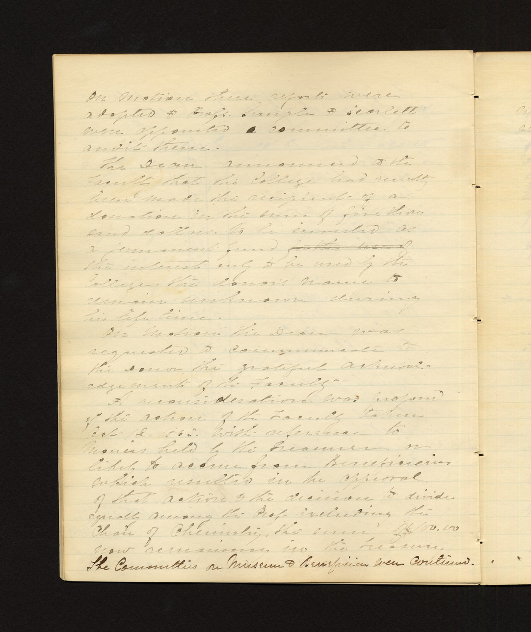 On motion these reports were adopted & Prof. Temple & Scarlett were appointed a committee to audit them. The Dean recommend to the faculty that the College had recently been made the recipient of a donation in the sum of five thousand dollars to be invested as a permanent fund with the interest only to be used if the college the donor's name to remain unknown during his lifetime. In the hour the Dean was requested to communique to the donor the grateful acknowledgments of the faculty. A consideration was proposed of the return of the faculty taken 20-12-68 with reference to movies held by the treasurer or likely to arise from beneficium, which resulted in the approval of that action & the decision to divide equally among the Dept including the Chair of Chemistry, the sum of $500.00 now remaining in the treasury. The Committees on Museum & Beneficien were continued.