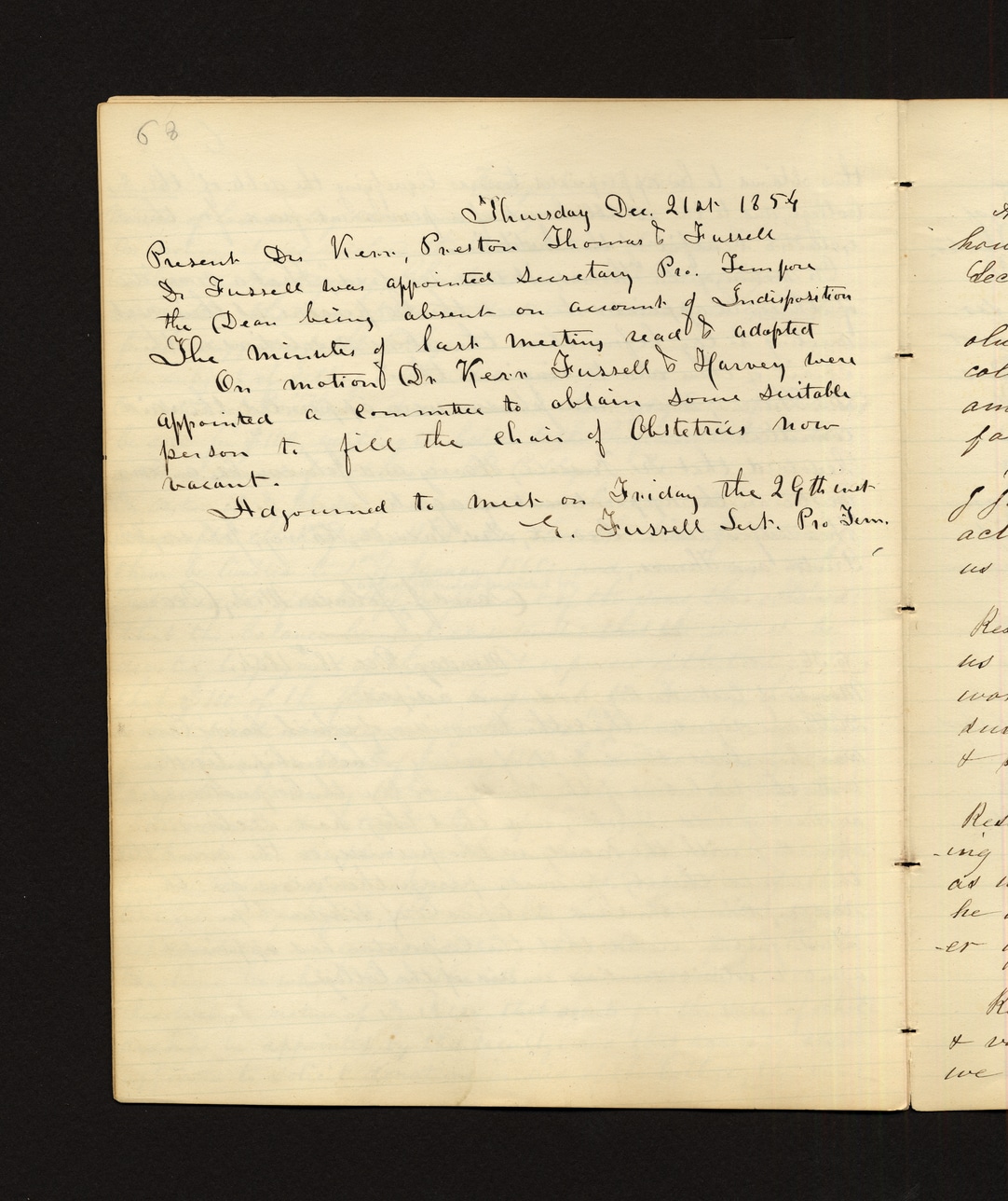 @file_a092_001_070_jpg:file -> depicts -> @resolution_memorial_johnsonThursday Dec. 21st 1854 Present Dr. Kerr, Preston Thomas T. Fussell Dr. Fussell was appointed Secretary Pro Tem for the Dean being absent on account of indisposition. The minutes of last meeting read & adopted. On motion Dr. Kerr Fussell & Harvey were appointed a committee to obtain some suitable person to fill the chair of Obstetrics now vacant. Adjourned to meet on Friday the 29th inst. T. Fussell Sec'y Pro Tem.