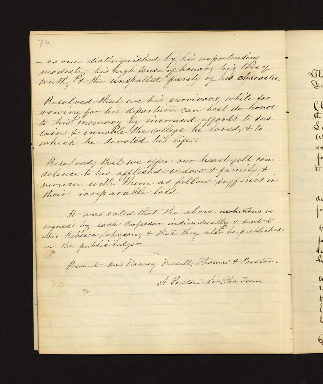 —as one distinguished by his unpretending modesty, his high sense of honor, his love of truth, & the unspotted purity of his character. Resolved that we, his survivors, while sorrowing for his departure, can best do honor to his memory by increased efforts to sustain & ennoble the college he loved, & to which he devoted his life. Resolved, that we offer our heart-felt condolence to his afflicted widow & family, & mourn with them as fellow-sufferers in their irreparable loss. It was voted that the above resolutions be signed by each professor individually & sent to Mrs. Rebecca Johnson, & that they also be published in the public ledger. Present—Srs Harvey, Fussell, Thomas & Preston. A. Preston, Sec. Pro. Tem.