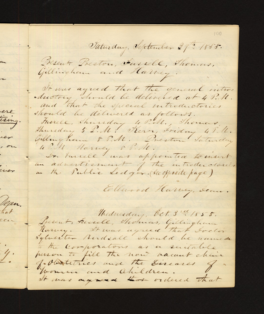 Saturday, September 27th, 1855. Present: Preston, Turrell, Thomas, Gillingham and Harvey. It was agreed that the general introductory should be delivered at 4 P.M., and that the special introductory should be delivered as follows: Turrell, Thursday 4 P.M. Thomas, Thursday 5 P.M. Kerr, Friday 4 P.M. Gillingham 5 P.M. Preston Saturday 4 P.M. Harvey 5 P.M. Dr. Turrell was appointed to insert an advertisement of the introductions in the Public Ledger. (See opposite page) Ellwood Harvey, Dean. Wednesday, Oct. 3rd, 1855. Present: Turrell, Thomas, Gillingham, Harvey. It was agreed that Doctor Sylvester Birdsall should be named to the corporations as a suitable person to fill the now vacant chair of Obstetrics and the Diseases of Women and Children. It was agreed to order that
