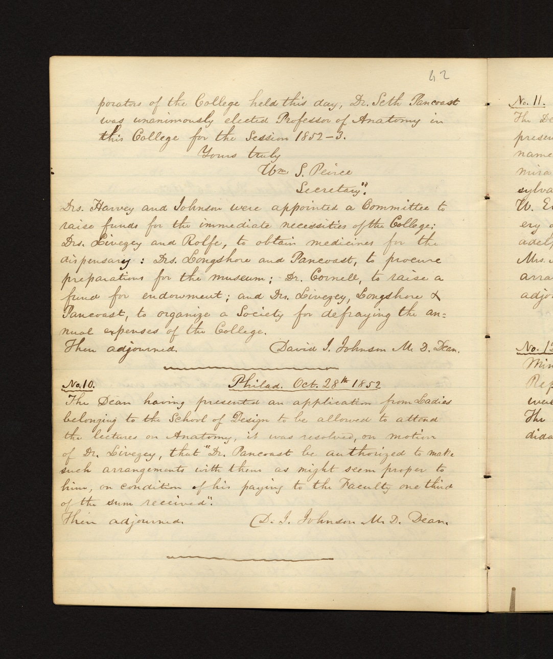 @file_a092_001_043_jpg:file {type: "image", description: "Pages 11‑12 of minute book (Jan. 12‑19 1853)", ocr_text: "No. 11. Philad. Jan. 12th 1853. ... No. 12. Philad. Jan. 19th 1853. Minutes of last three meetings read and adopted..."}Porators of the College held this day, Dr. Seth Pancoast was unanimously elected Professor of Anatomy in this College for the Session 1852-3. Yours truly, Wm. S. Peirce Secretary. Drs. Harvey and Johnson were appointed a Committee to raise funds for the immediate necessities of the College; Drs. Livezey and Rolfe, to obtain medicines for the dispensary; Drs. Longshore and Pancoast, to procure preparations for the museum; Dr. Cornell, to raise a fund for endowment; and Drs. Livezey, Longshore & Pancoast, to organize a Society for defraying the annual expenses of the College. Then adjourned. David I. Johnson M.D. Dean. No. 10. Philad. Oct. 28th 1852 The Dean having presented an application from Ladies belonging to the School of Design to be allowed to attend the lectures on Anatomy, it was resolved, on motion of Dr. Livezey, that "Dr. Pancoast be authorized to make such arrangements with them as might seem proper to him, on condition of his paying to the Faculty one third of the sum received." Then adjourned. David I. Johnson M.D. Dean.