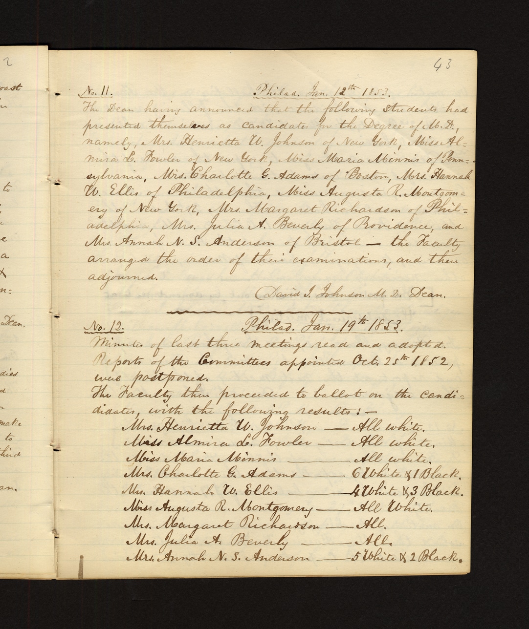 No. 11. Philad. Jan. 12th 1853. The Dean having announced that the following students had presented themselves as candidates for the Degree of M.D., namely, Mrs. Henrietta W. Johnson of New York, Miss Almira L. Fowler of New York, Miss Maria McKinnis of Pennsylvania, Mrs. Charlotte G. Adams of Boston, Mrs. Hannah W. Ellis of Philadelphia, Miss Augusta R. Montgomery of New York, Mrs. Margaret Richardson of Philadelphia, Mrs. Julia A. Beverly of Providence, and Mrs. Annah N. S. Anderson of Bristol—the Faculty arranged the order of their examinations, and then adjourned. David I. Johnson M.D. Dean. No. 12. Philad. Jan. 19th 1853. Minutes of last three meetings read and adopted. Reports of the Committees appointed Oct. 25th 1852, was postponed. The Faculty then proceeded to ballot on the candidates, with the following results: Mrs. Henrietta W. Johnson—All white. Miss Almira L. Fowler—All white. Miss Maria McKinnis—All white. Mrs. Charlotte G. Adams—6 White & 1 Black. Mrs. Hannah W. Ellis—4 White & 3 Black. Miss Augusta R. Montgomery—All white. Mrs. Margaret Richardson—All. Mrs. Julia A. Beverly—All. Mrs. Annah N. S. Anderson—5 White & 2 Black.