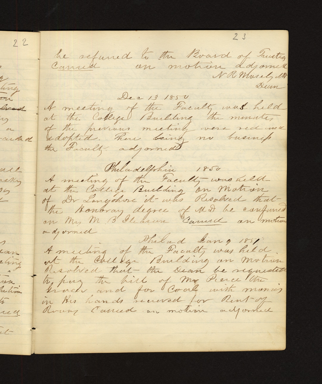 he referred to the Board of Trustees Carried on motion adjourned N R Murrey Dr Dean Dec 13 1850 A meeting of the Faculty was held at the College Building the minutes of the previous meeting were read and adopted. There being no business the Faculty adjourned. Philadelphia 1850 A meeting of the Faculty was held at the College Building on motion of Dr Longshore it was Resolved that the honorary degree of M.D be conferred on Mrs M B Gleason Carried an motion adjourned Phila d Jan 9 1851 A meeting of the Faculty was held at the College Building on motion Resolved that the Dean be requested to pay the bill of Mr Pierce the Grack and for Coal with money in his hands received for Rent of Rooms Carried on motion adjourned
