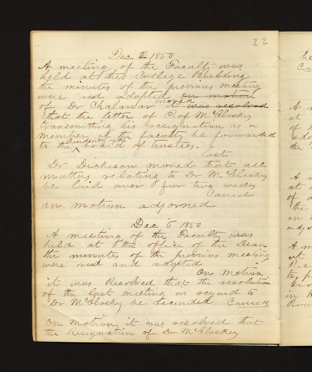 @date_1851_01_09Dec 2, 1850 A meeting of the Faculty was held at the College Building. The minutes of the previous meeting were read and adopted on motion of Dr. Chaloner. It was resolved that the letter of Prof. M. Glassy transmitting his resignation as a member of the faculty be forwarded to the President of the Board of Trustees. Dr. Dickson moved that all matters relating to Dr. M. Glassy be laid over for two weeks. Carried on motion adjourned. Dec 6, 1850 A meeting of the Faculty was held at the office of the Dean. The minutes of the previous meeting were read and adopted. On motion it was resolved that the resolution of the last meeting in regard to Dr. M. Glassy be rescinded. Carried On motion it was resolved that the Resignation of Dr. M. Glassy