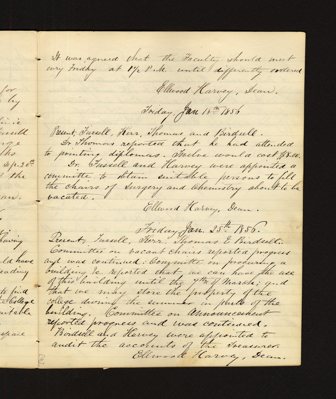 It was agreed that the Faculty should meet every Friday at 1/2 P.M. until differently ordered. Ellwood Harvey, Dean. Friday Jan. 18th 1856 Present: Fussell, Kerr, Thomas and Birdsell. Dr. Thomas reported that he had attended to printing diplomas. Twelve would cost $8.00. Dr. Fussell and Harvey were appointed a committee to obtain suitable persons to fill the chairs of surgery and chemistry about to be vacated. Ellwood Harvey, Dean. Friday Jan. 25th 1856 Present: Fussell, Kerr, Thomas & Birdsell. Committee on vacant chairs reported progress and was continued. Committee on procuring a building etc. reported that we can have the use of this building until the 7th of March; and that we may store the property of the college during the summer in parts of the building. Committee on Announcement reported progress and was continued. Birdsell and Harvey were appointed to audit the accounts of the Treasurer. Ellwood Harvey, Dean.