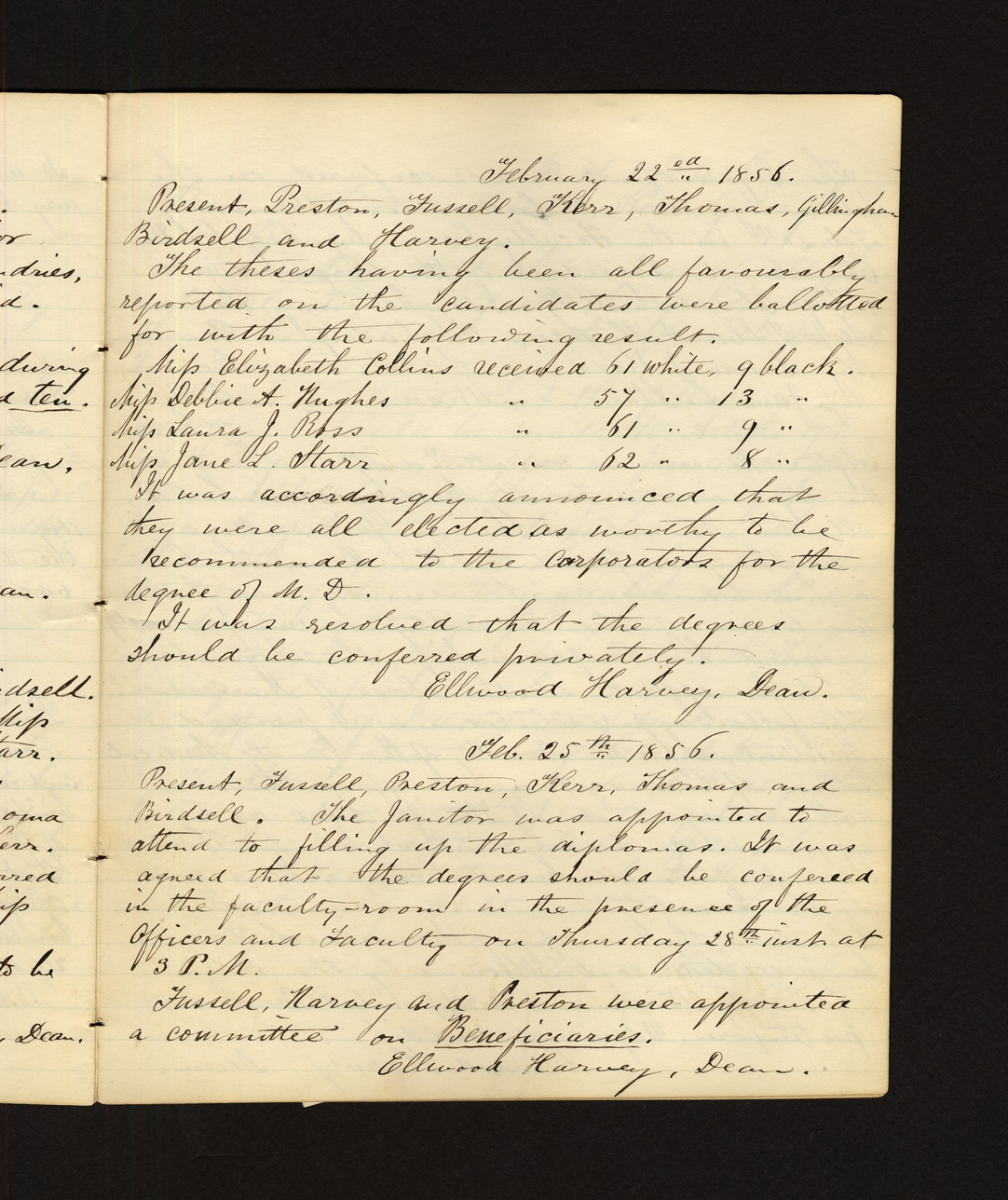 February 22nd, 1856. Present, Preston, Russell, Kerr, Thomas, Gilfillan, Birdsell and Harvey. The theses having been all favourably reported on the candidates were ballotted for with the following result. Miss Elizabeth Collins received 61 white, 9 black. Miss Debbie A. Hughes 57 13 Miss Laura J. Ross 61 9 Miss Jane L. Starr 62 8 It was accordingly announced that they were all elected as worthy to be recommended to the corporators for the degree of M.D. It was resolved that the degrees should be conferred privately. Ellwood Harvey, Dean. Feb. 25th, 1856. Present, Russell, Preston, Kerr, Thomas and Birdsell. The janitor was appointed to attend to filling up the diplomas. It was agreed that the degrees should be conferred in the faculty-room in the presence of the officers and faculty on Thursday 28th inst at 3 P.M. Russell, Harvey and Preston were appointed a committee on Beneficiaries. Ellwood Harvey, Dean.