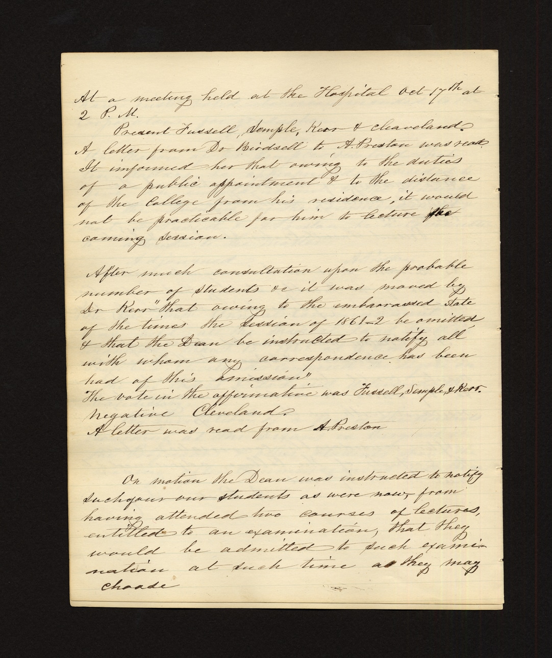 At a meeting held at the Hospital Oct 17th at 2 P.M. Present: Fussell, Semple, Kerr & Cleveland. A letter from Dr. Birdsall to A. Preston was read. It informed her that owing to the duties of a public appointment & to the distance of the College from his residence, it would not be practicable for him to lecture the coming session. After much consultation upon the probable number of students &c it was moved by Dr. Kerr "that owing to the embarrassed state of the times the session of 1861-2 be omitted & that the Dean be instructed to notify all with whom any correspondence has been had of this omission." The vote in the affirmative was Fussell, Semple & Kerr. Negative Cleveland. A letter was read from A. Preston On motion the Dean was instructed to notify such of our students as were now from having attended two courses of lectures, entitled to an examination, that they would be admitted to such examination at such time as they may choose.