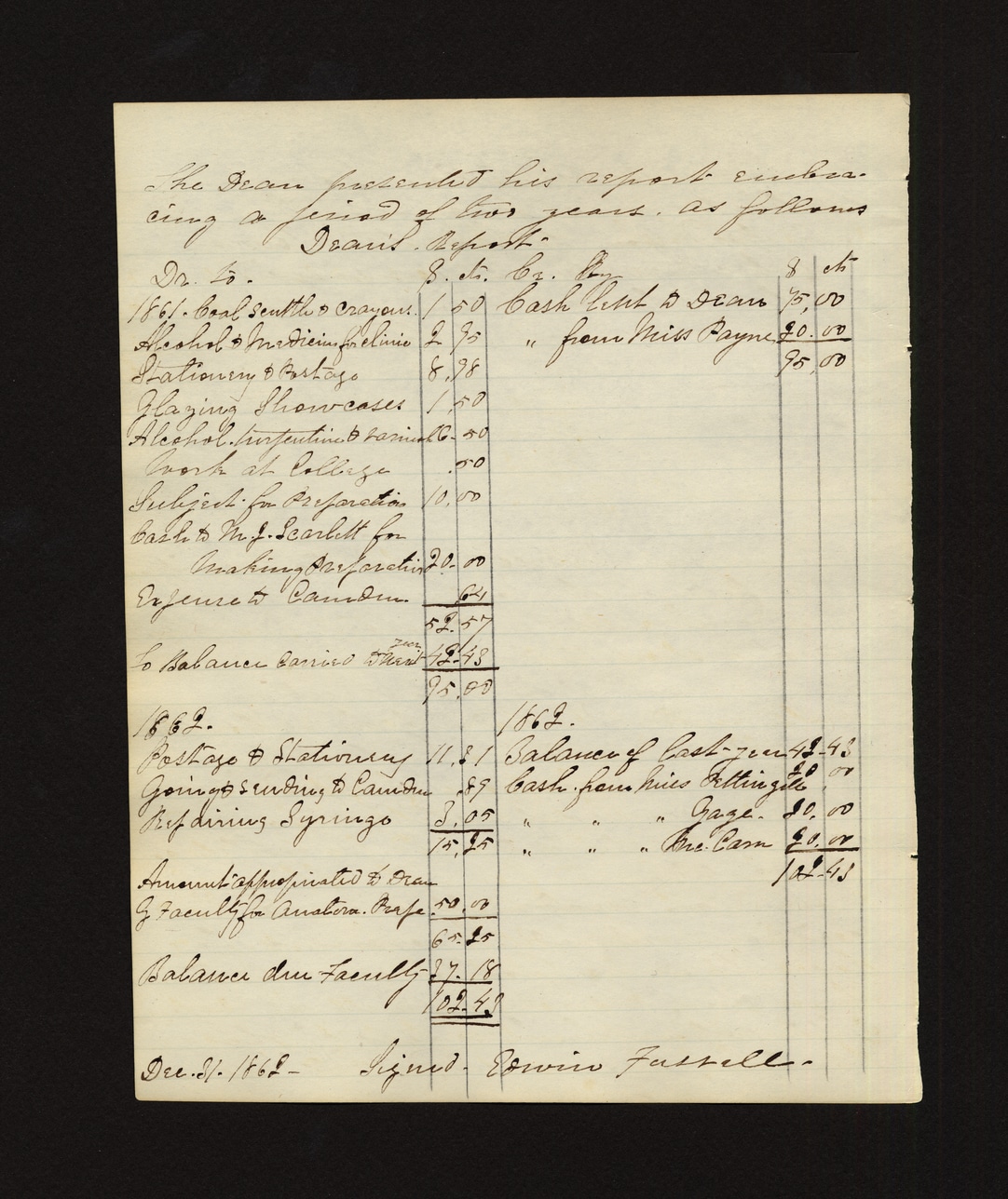 The Dean presented his report covering a period of two years, as follows: Dean's Report Dr. S. 1861. Coal South & Carriage 1.50 Alcohol & Medicine for clinic 2.93 Stationery & postage 8.98 Glazing Showcases 1.50 Alcohol, turpentine & varnish .50 Work at College .50 Subject for preparation 10.00 Cash to M.J. Scarlett for making preparation 2.00 Expense to Camden .64 52.57 To balance carried forward 42.43 95.00 1862. Postage & Stationery 11.81 Going & sending to Camden .89 Refining Springs 3.05 15.75 Amount appropriated to Dean & Faculty for Amatona. Rape 50.00 60.25 Balance due Faculty 27.18 102.43 1862. Balance of Cash - year 42-43 42.43 Cash from Miss Fellingill .00 " " " Grace .10.00 " " " Mrs. Barr .20.00 102.43 Dec. 31, 1862 Signed: Edwin Fassell