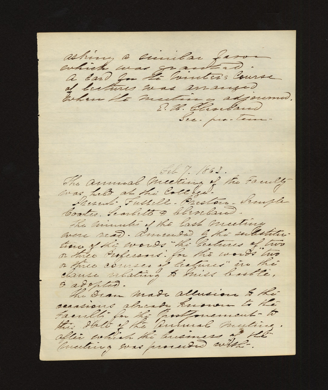 @file_a092_001_154_jpg -> part of -> @minute_book_1850_1864Asking a similar favor which was granted. A card for the Winter's Course of lectures was arranged when the meeting adjourned. E.H. Cleveland Sec. pro-tem. Feb 7, 1863. The annual meeting of the Faculty was held at the College. President Fussell, Preston, Sprague, Coates, Scarlett & Cleveland. The minutes of the last meeting were read. Amended by the substitution of the words "the lectures of two or three Professors" for the words "two or three courses of lectures" in the clause relating to Miss Bostle, & adopted. The Dean made allusion to the occasions already known to the Faculty for the postponement to this date of the Annual Meeting, after which the business of the meeting was proceeded with.