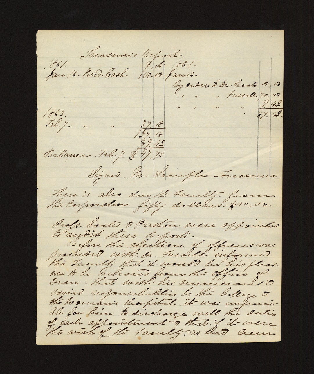 Treasury's Report. 1861. Jan 16 - Recd. Cash. $100.00 1861. Jan 16. By order to Dr. Boates $5.00 " " " Fussell $75.00 " " " " " 9.42 " " " " " 89.42 1863. Feb 7. " " $7.18 $7.18 $9.42 Balance Feb. 7. $47.16 Signed M. Sample - Treasurer. There is also due the Faculty from the Corporation fifty dollars. $50.00. Profs. Boates & Preston were appointed to audit these reports. Before the election of officers was pronounced with, Dr. Fussell informed the faculty that it would be his pleasure to be relieved from the office of Dean. That with his numerous and varied responsibilities to the College & the Woman's Hospital it was impossible for him to discharge well the duties of such appointment - & that if it were the wish of the faculty as had been