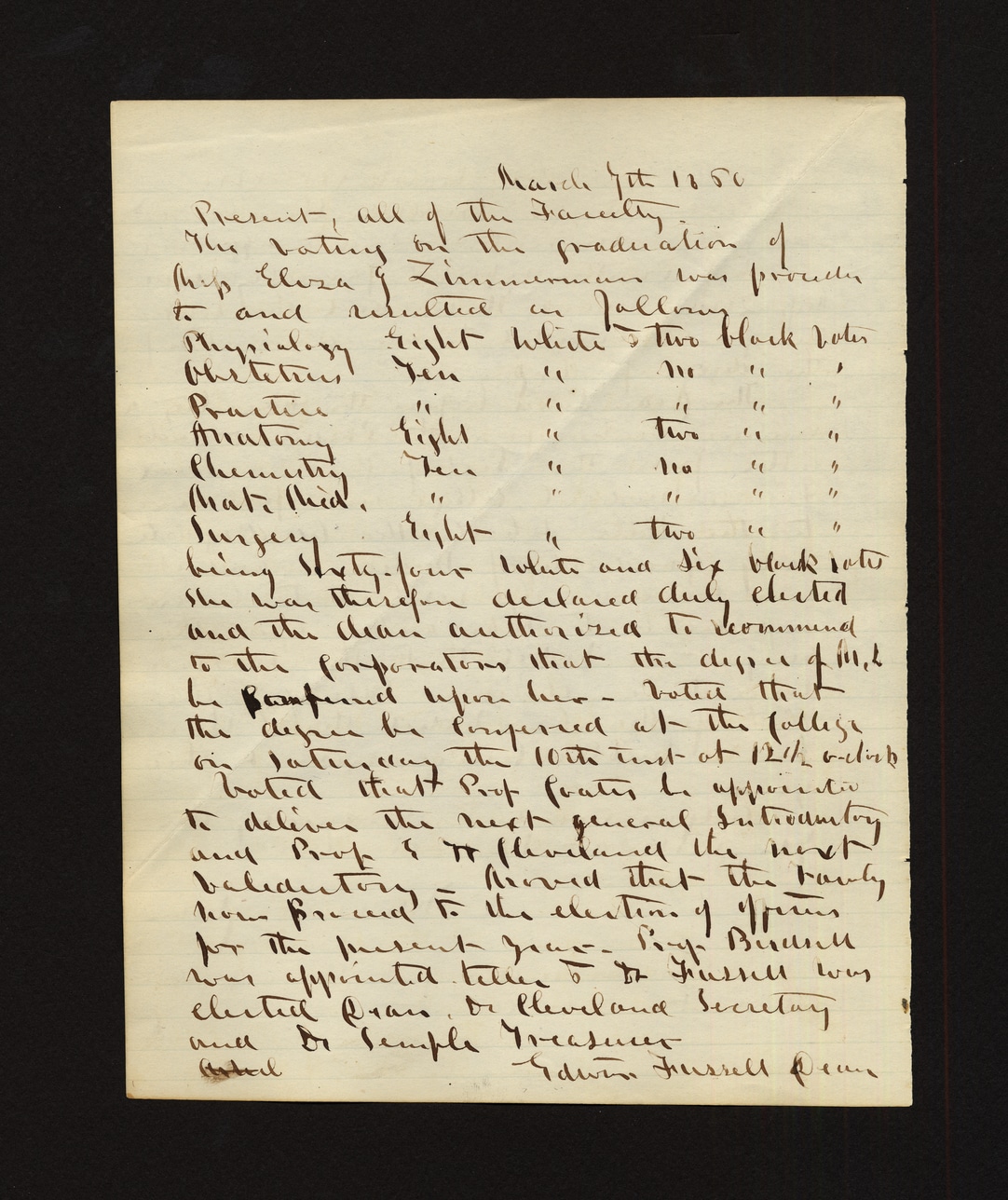 @file_pinax -> metadata for -> @graduation_proceedings_1860:eventMarch 7th 1850 Present: All of the Faculty. The voting on the graduation of Miss Eliza J. Zimmerman was proceeded to and resulted in following: Physiology Eight White & two Black votes Obstetrics Ten " " " " Practice " " " " Anatomy Eight " " two " " Chemistry Ten " " ten " " Mat. Med. " " " " Surgery Eight " " two " " Being sixty-four white and six black votes she was therefore declared duly elected and the dean authorized to recommend to the Corporators that the degree of M.D. be conferred before her—voted that the degree be conferred at the college on Saturday the 10th inst at 12 1/2 o'clock. Voted that Prof. Coates be appointive to deliver the next general Introductory and Prof. E. H. Cleveland the next Valedictory—Moved that the faculty now proceed to the election of officers for the present year—Prof. Bennett was appointed teller to Dr. Fennell was elected Dean, Dr. Cleveland Secretary and Dr. Temple Treasurer. Edwin Fennell Dean