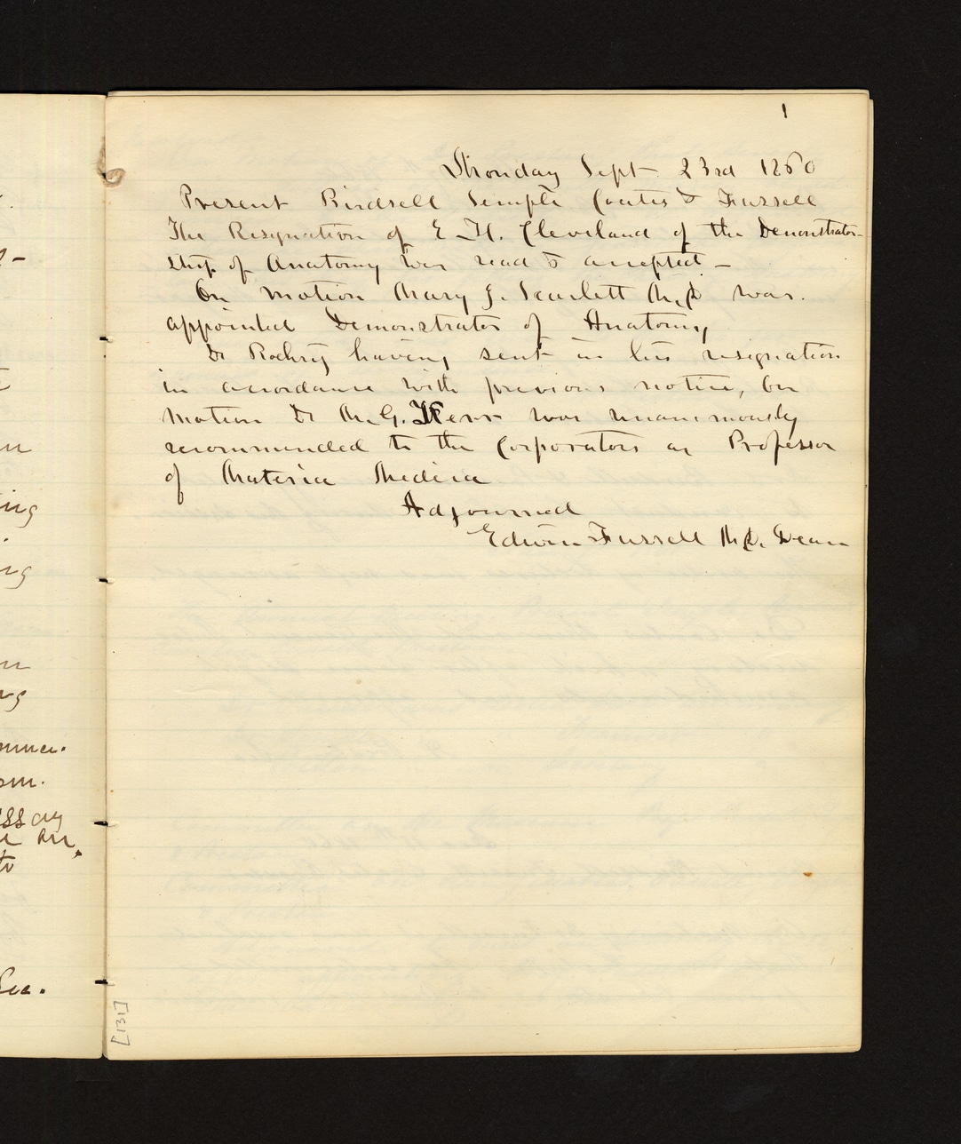 @faculty_minute_book -> source for -> @faculty_resignation_recordsMonday Sept 23rd 1860 Present: Binsdell, Temple (notes) & Fursell The Resignation of E.H. Cleveland of the Demonstratorship of Anatomy was read & accepted. On motion Mary J. Scarlett M.D. was appointed Demonstrator of Anatomy. Dr. Roche having sent in his resignation in accordance with previous notice, on motion Dr. Mcg. Kerr was unanimously recommended to the Corporators as Professor of materia medica. Adjourned Edwin Fursell M.D. Dean