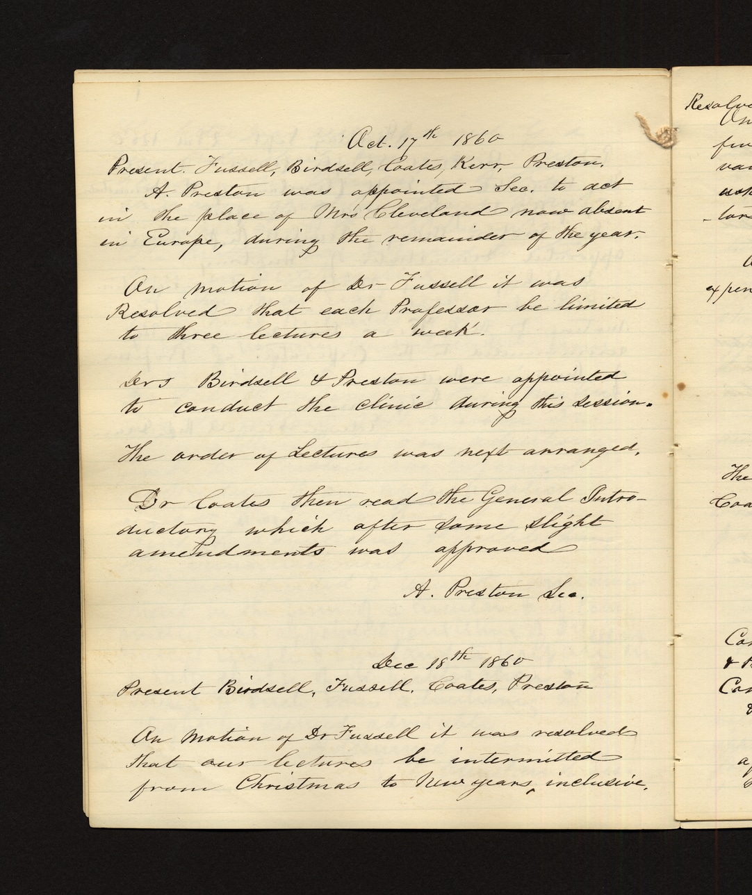 @female_medical_college_of_pennsylvania -> located at -> @229_arch_street_philadelphiaOct. 17th, 1860 Present: Fussell, Birdsell, Coates, Kerr, Preston. A. Preston was appointed Sec. to act in the place of Mrs. Cleveland now absent in Europe, during the remainder of the year. On motion of Dr. Fussell it was Resolved that each Professor be limited to three lectures a week. Jrs Birdsell & Preston were appointed to conduct the Clinic during this session. The order of lectures was next arranged. Dr. Coates then read the General Introduction which after some slight amendments was approved. A. Preston Sec. Dec 18th, 1860 Present Birdsell, Fussell, Coates, Preston On motion of Dr. Fussell it was resolved that our lectures be intermitted from Christmas to New years, inclusive.