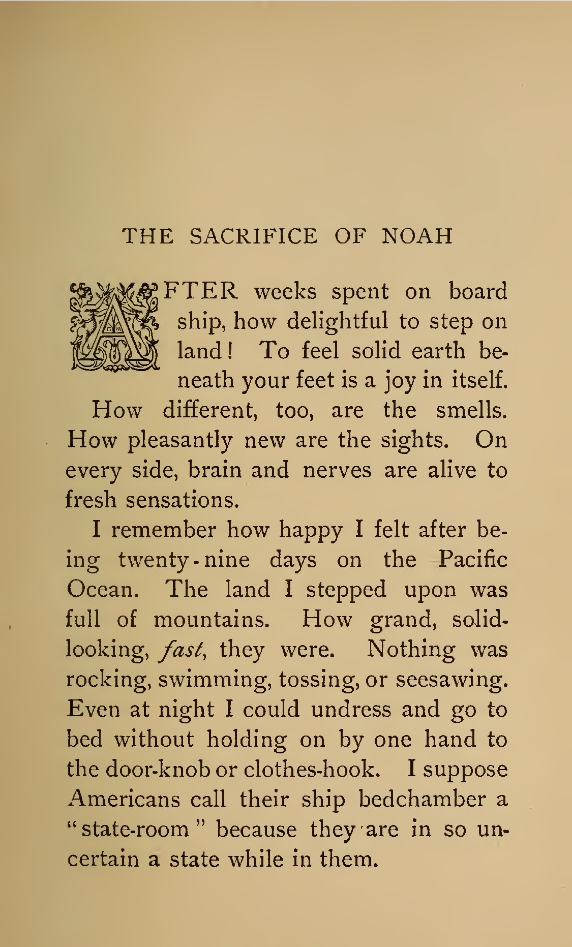 - # THE SACRIFICE OF NOAH  FTER weeks spent on board ship, how delightful to step on land! To feel solid earth beneath your feet is a joy in itself. How different, too, are the smells. How pleasantly new are the sights. On every side, brain and nerves are alive to fresh sensations. I remember how happy I felt after being twenty-nine days on the Pacific Ocean. The land I stepped upon was full of mountains. How grand, solid-looking, *fast*, they were. Nothing was rocking, swimming, tossing, or seesawing. Even at night I could undress and go to bed without holding on by one hand to the door-knob or clothes-hook. I suppose Americans call their ship bedchamber a “state-room” because they are in so uncertain a state while in them.