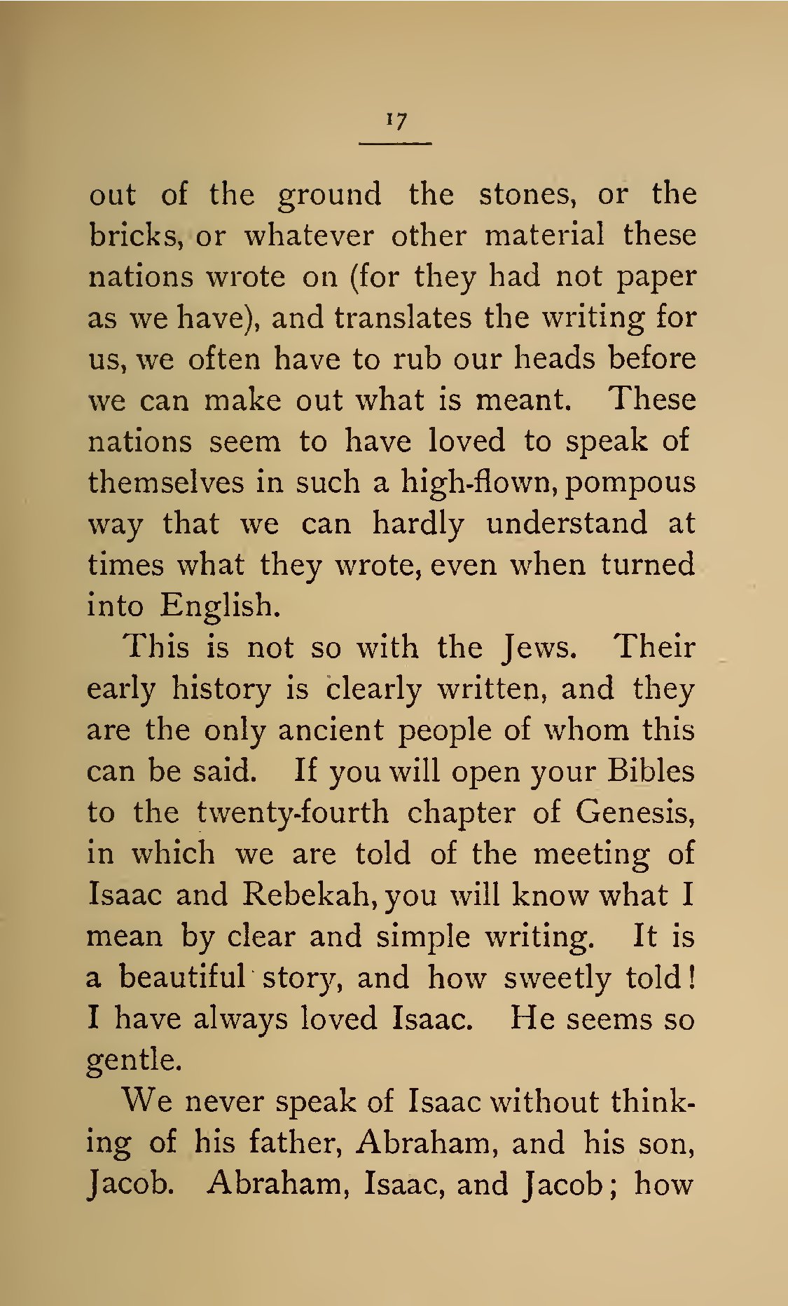 - 17 out of the ground the stones, or the bricks, or whatever other material these nations wrote on (for they had not paper as we have), and translates the writing for us, we often have to rub our heads before we can make out what is meant. These nations seem to have loved to speak of themselves in such a high-flown, pompous way that we can hardly understand at times what they wrote, even when turned into English. This is not so with the Jews. Their early history is clearly written, and they are the only ancient people of whom this can be said. If you will open your Bibles to the twenty-fourth chapter of Genesis, in which we are told of the meeting of Isaac and Rebekah, you will know what I mean by clear and simple writing. It is a beautiful story, and how sweetly told! I have always loved Isaac. He seems so gentle. We never speak of Isaac without thinking of his father, Abraham, and his son, Jacob. Abraham, Isaac, and Jacob; how