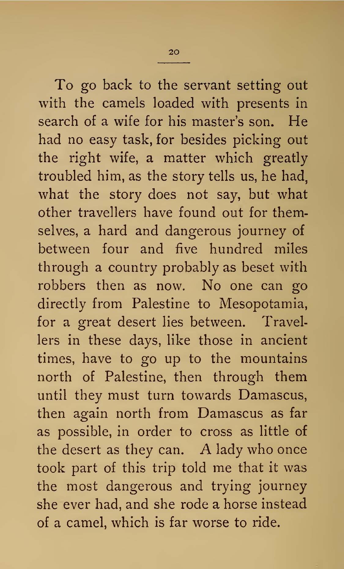 - 20 To go back to the servant setting out with the camels loaded with presents in search of a wife for his master’s son. He had no easy task, for besides picking out the right wife, a matter which greatly troubled him, as the story tells us, he had, what the story does not say, but what other travellers have found out for themselves, a hard and dangerous journey of between four and five hundred miles through a country probably as beset with robbers then as now. No one can go directly from Palestine to Mesopotamia, for a great desert lies between. Travellers in these days, like those in ancient times, have to go up to the mountains north of Palestine, then through them until they must turn towards Damascus, then again north from Damascus as far as possible, in order to cross as little of the desert as they can. A lady who once took part of this trip told me that it was the most dangerous and trying journey she ever had, and she rode a horse instead of a camel, which is far worse to ride.
