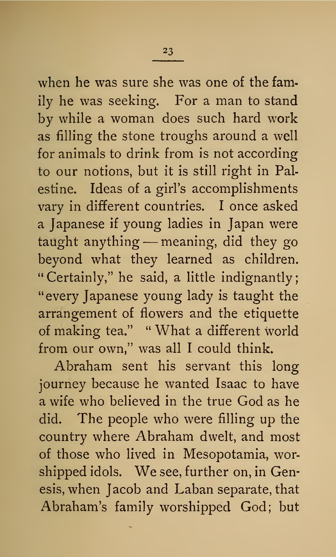 - 23 when he was sure she was one of the family he was seeking. For a man to stand by while a woman does such hard work as filling the stone troughs around a well for animals to drink from is not according to our notions, but it is still right in Palestine. Ideas of a girl’s accomplishments vary in different countries. I once asked a Japanese if young ladies in Japan were taught anything — meaning, did they go beyond what they learned as children. “Certainly,” he said, a little indignantly; “every Japanese young lady is taught the arrangement of flowers and the etiquette of making tea.” “What a different world from our own,” was all I could think. Abraham sent his servant this long journey because he wanted Isaac to have a wife who believed in the true God as he did. The people who were filling up the country where Abraham dwelt, and most of those who lived in Mesopotamia, worshipped idols. We see, further on, in Genesis, when Jacob and Laban separate, that Abraham’s family worshipped God; but