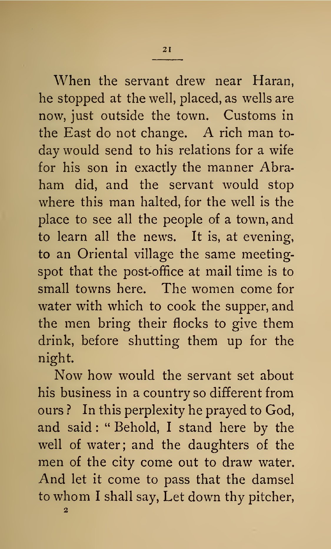 - 21 When the servant drew near Haran, he stopped at the well, placed, as wells are now, just outside the town. Customs in the East do not change. A rich man today would send to his relations for a wife for his son in exactly the manner Abraham did, and the servant would stop where this man halted, for the well is the place to see all the people of a town, and to learn all the news. It is, at evening, to an Oriental village the same meeting-spot that the post-office at mail time is to small towns here. The women come for water with which to cook the supper, and the men bring their flocks to give them drink, before shutting them up for the night. Now how would the servant set about his business in a country so different from ours? In this perplexity he prayed to God, and said: “Behold, I stand here by the well of water; and the daughters of the men of the city come out to draw water. And let it come to pass that the damsel to whom I shall say, Let down thy pitcher, 2