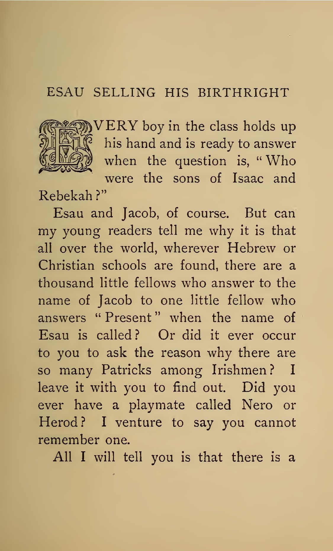 - # ESAU SELLING HIS BIRTHRIGHT  VERY boy in the class holds up his hand and is ready to answer when the question is, “Who were the sons of Isaac and Rebekah?” Esau and Jacob, of course. But can my young readers tell me why it is that all over the world, wherever Hebrew or Christian schools are found, there are a thousand little fellows who answer to the name of Jacob to one little fellow who answers “Present” when the name of Esau is called? Or did it ever occur to you to ask the reason why there are so many Patricks among Irishmen? I leave it with you to find out. Did you ever have a playmate called Nero or Herod? I venture to say you cannot remember one. All I will tell you is that there is a