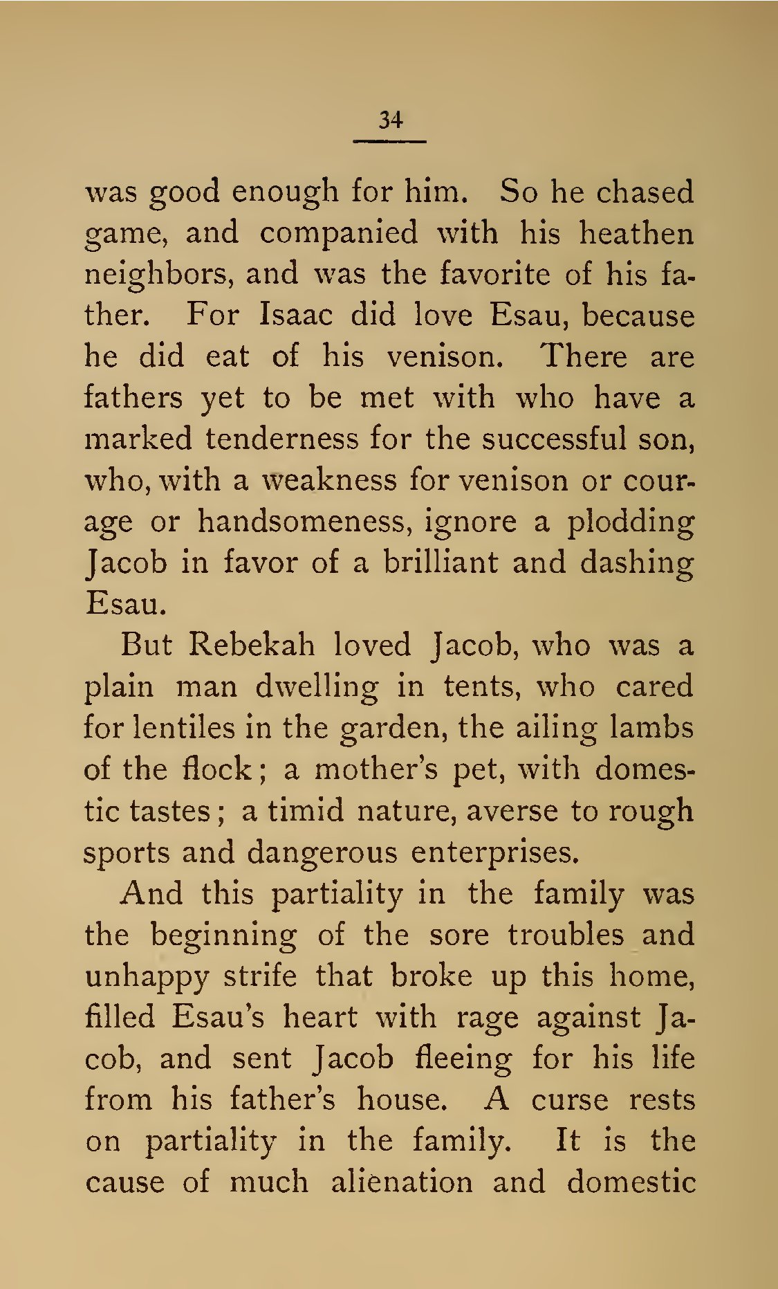 - 34 was good enough for him. So he chased game, and companied with his heathen neighbors, and was the favorite of his father. For Isaac did love Esau, because he did eat of his venison. There are fathers yet to be met with who have a marked tenderness for the successful son, who, with a weakness for venison or courage or handsomeness, ignore a plodding Jacob in favor of a brilliant and dashing Esau. But Rebekah loved Jacob, who was a plain man dwelling in tents, who cared for lentiles in the garden, the ailing lambs of the flock; a mother's pet, with domestic tastes; a timid nature, averse to rough sports and dangerous enterprises. And this partiality in the family was the beginning of the sore troubles and unhappy strife that broke up this home, filled Esau's heart with rage against Jacob, and sent Jacob fleeing for his life from his father's house. A curse rests on partiality in the family. It is the cause of much alienation and domestic