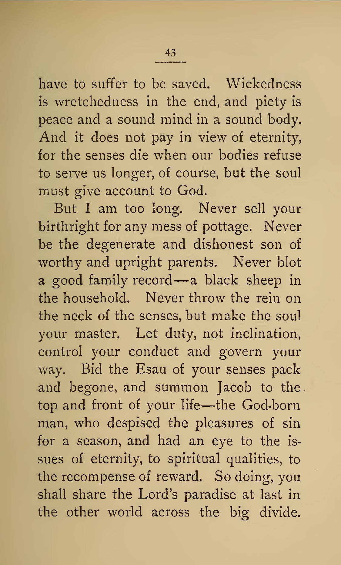- 43 have to suffer to be saved. Wickedness is wretchedness in the end, and piety is peace and a sound mind in a sound body. And it does not pay in view of eternity, for the senses die when our bodies refuse to serve us longer, of course, but the soul must give account to God. But I am too long. Never sell your birthright for any mess of pottage. Never be the degenerate and dishonest son of worthy and upright parents. Never blot a good family record—a black sheep in the household. Never throw the rein on the neck of the senses, but make the soul your master. Let duty, not inclination, control your conduct and govern your way. Bid the Esau of your senses pack and begone, and summon Jacob to the top and front of your life—the God-born man, who despised the pleasures of sin for a season, and had an eye to the issues of eternity, to spiritual qualities, to the recompense of reward. So doing, you shall share the Lord’s paradise at last in the other world across the big divide.